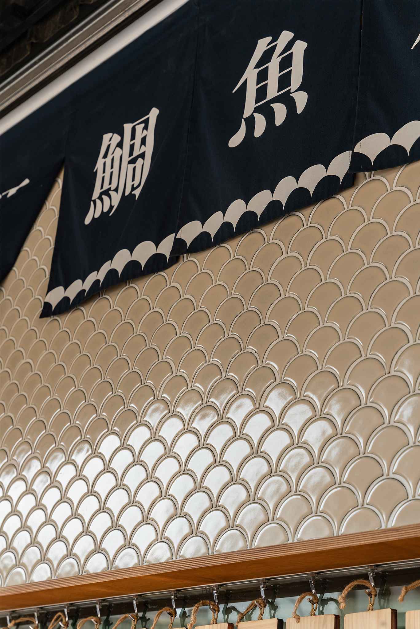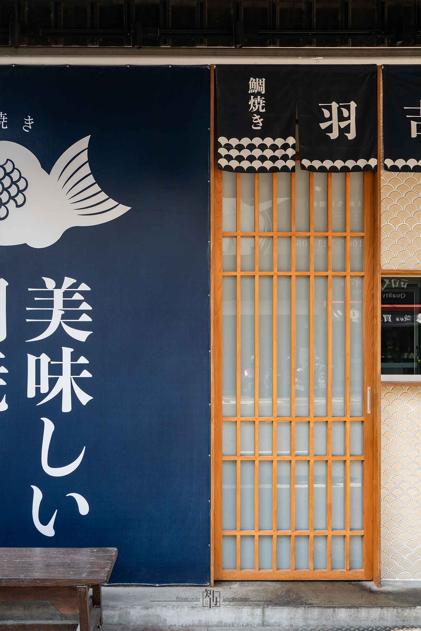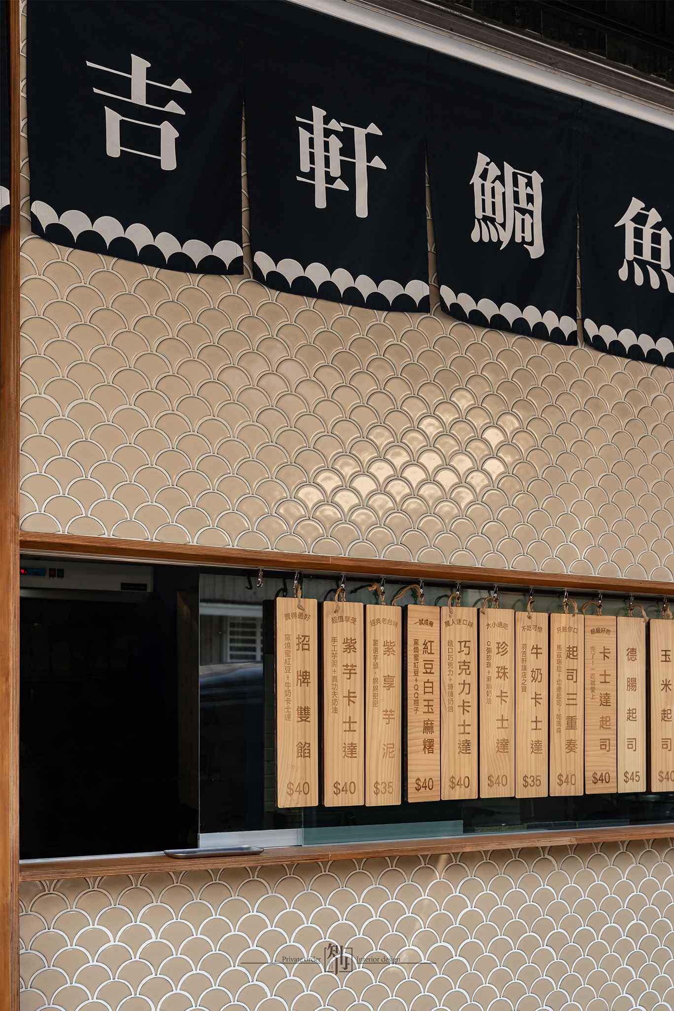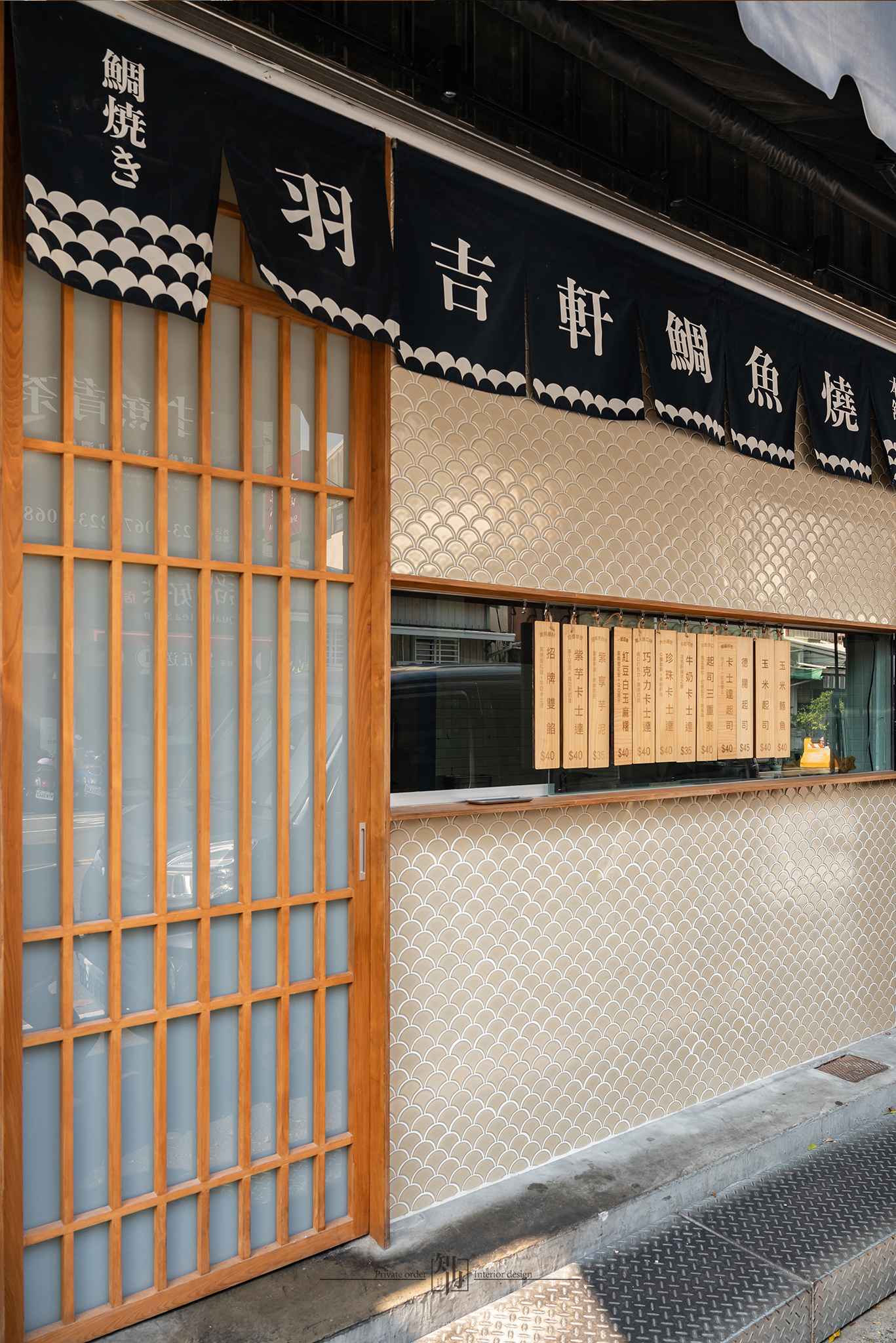 這家位於台南街頭的隱藏日本在地鯛魚燒店,以魚鱗片為靈感設計的牆面磁磚,與店內販售的商品相得益彰,創造出一種整體一致的感覺。木紋色搭配的門片和深藍色的掛布配置,進一步展現了日本街頭風格的特色。