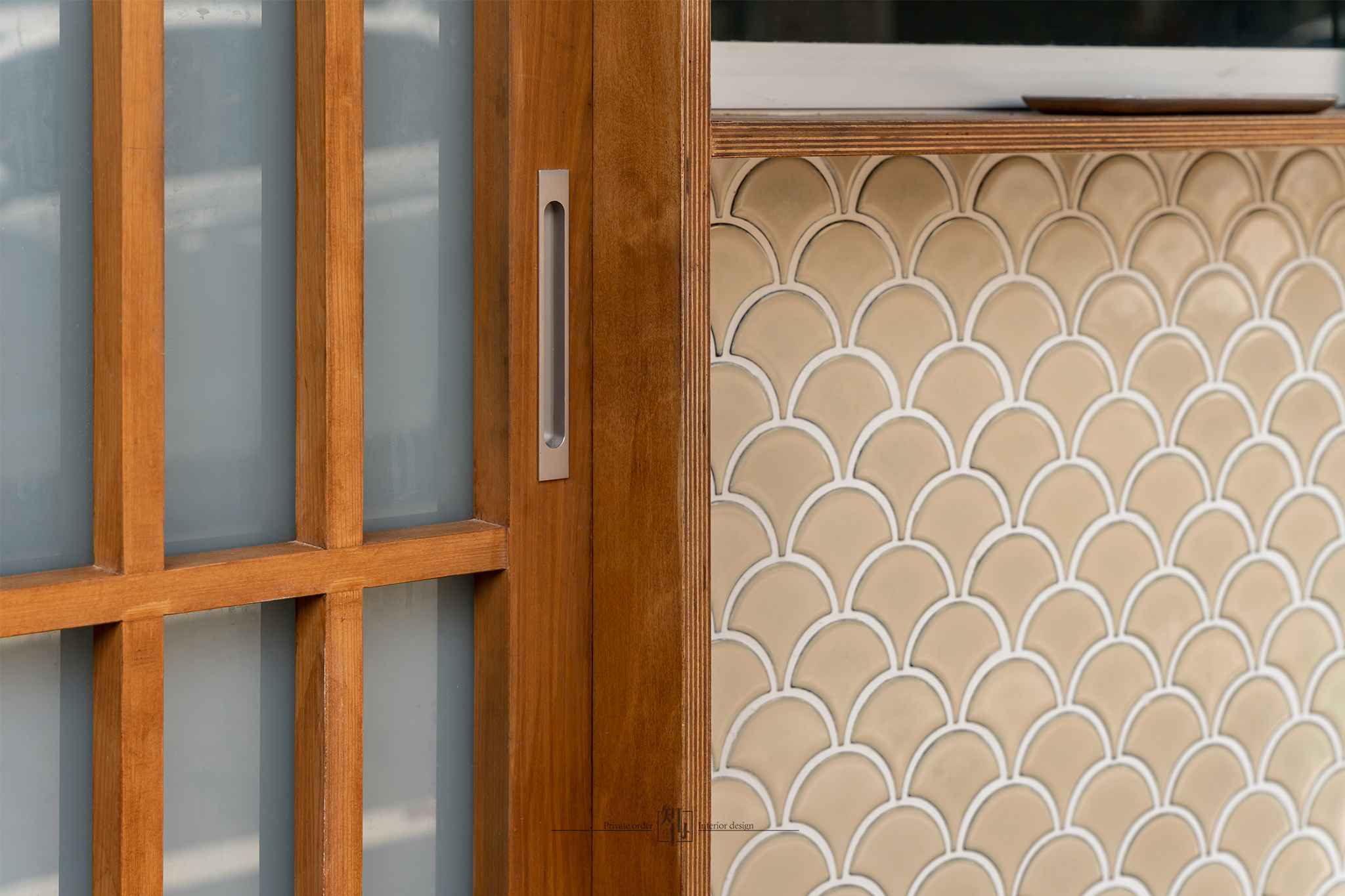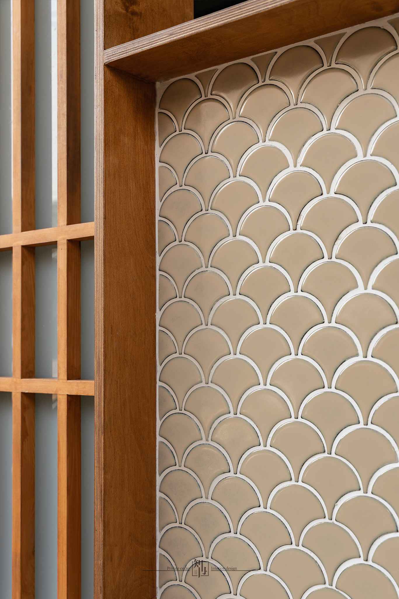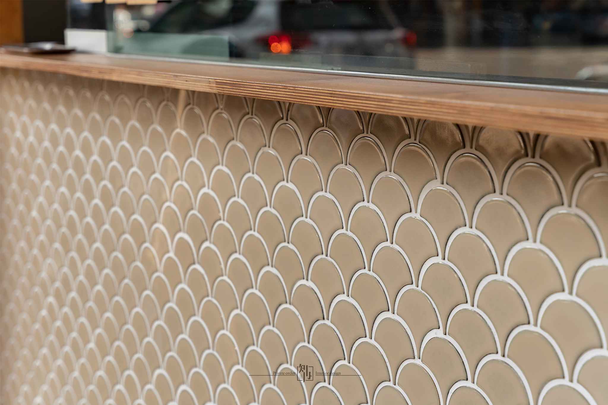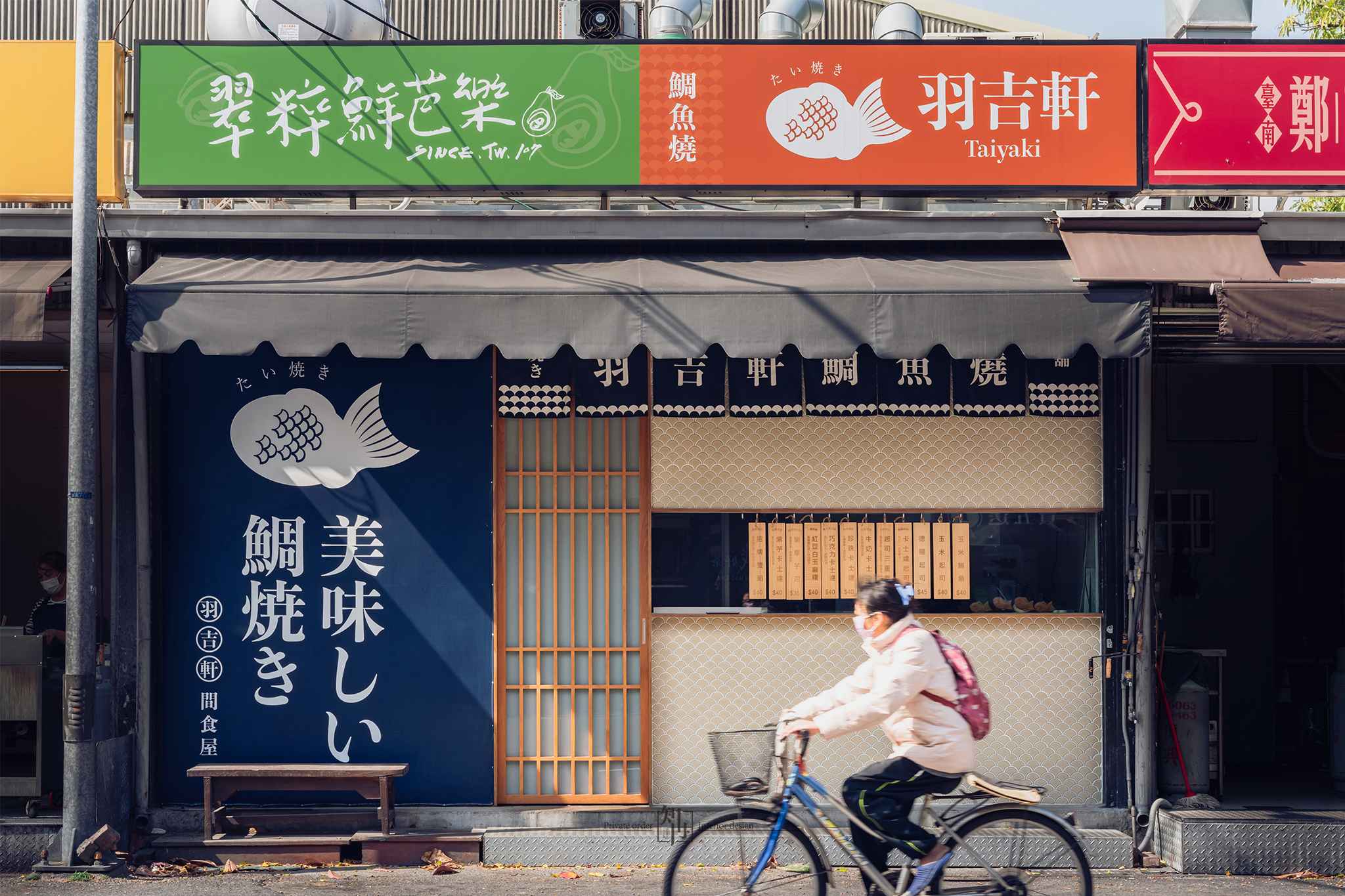 這家位於台南街頭的隱藏日本在地鯛魚燒店,以魚鱗片為靈感設計的牆面磁磚,與店內販售的商品相得益彰,創造出一種整體一致的感覺。木紋色搭配的門片和深藍色的掛布配置,進一步展現了日本街頭風格的特色。