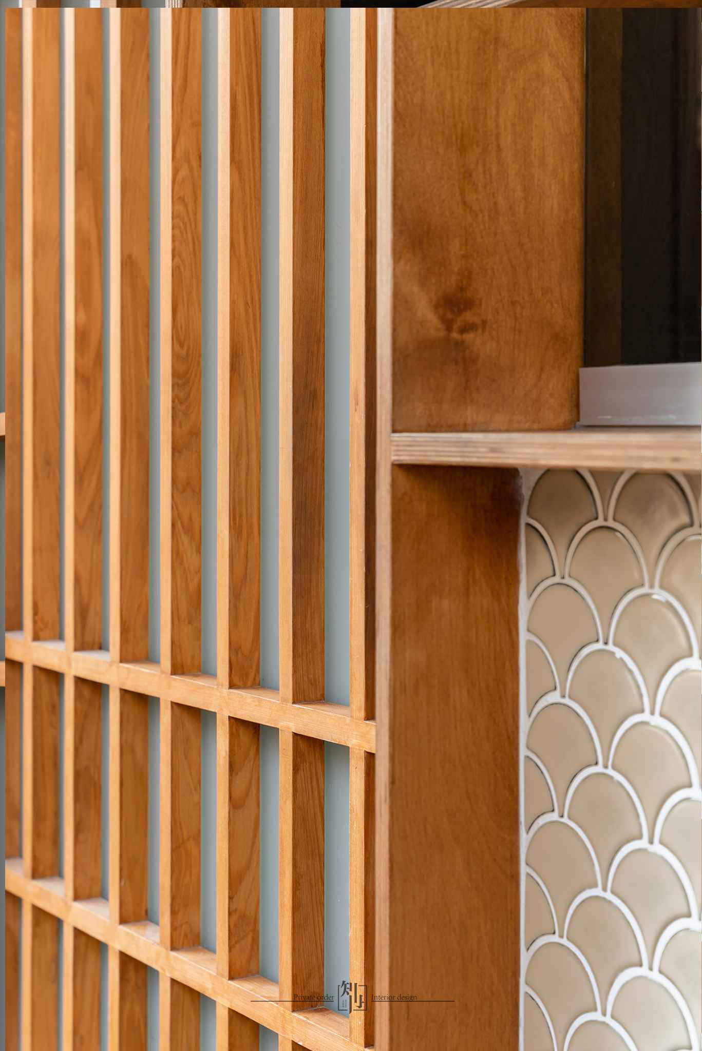 This hidden Japanese local taiyaki shop on the streets of Tainan showcases a design concept inspired by fish scales on its wall tiles, creating a seamless connection with the products being sold. The choice of wood grain tones for the door panels and the placement of deep blue hanging fabrics contribute to the presentation of a Japanese street-style atmosphere.