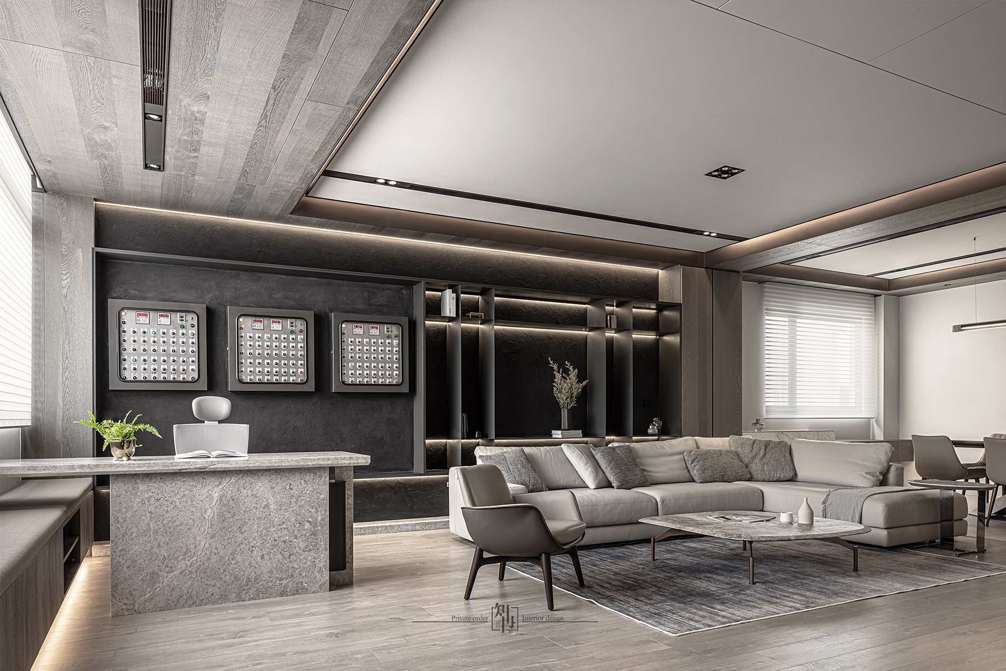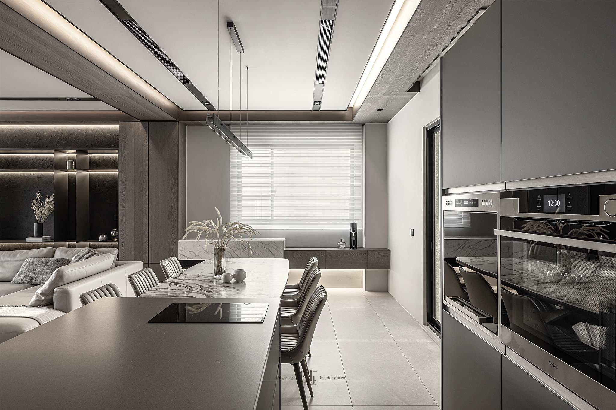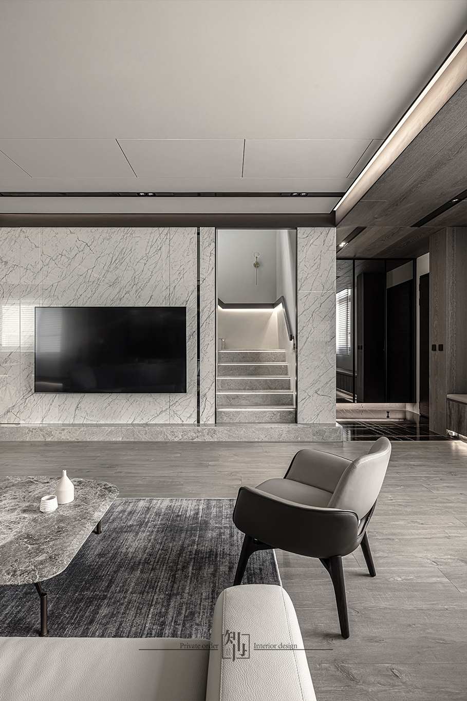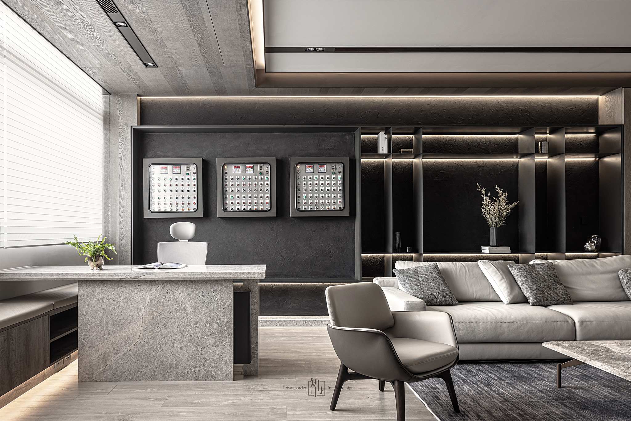 此案為自地自建複合式住宅,業主本身為農產業,在規劃住宅空間方面除了住宅空間規劃外,還要規劃智能農產設備空間,在工作與生活中找到美的平衡點,並結合現代美學讓整體更有加分的效果;住宅的建築外觀極簡純粹,卻在走進家門時別有洞天,一脈奢雅大理石漫流淌開,依循著立面蔓延至客廳與餐廚,此案的業主對於風水格局非常講究,所以在空間規劃上也進行了許多調整,以樓梯定錨中心,將電視牆揉合其中,而第一段階梯則同步涵括平台用途,輔助上下樓也能擺放影音設備,相映對向,分別以工作桌、沙發與餐桌椅定義各場域,而本案的一大重點,即是設置養殖場的智能控制箱,其主要用途正是控制農舍養殖場的溫濕度、飼料與飲水等,在評估操作動線與美觀性後,捨棄原本以摺疊門修飾的作法,決定直接美化設備外觀,宛若化作設計元素之一,序列成辦公區域的背景,在業主不用出門的情況下,也能隨時關照養殖場的情況,在無形之中切分空間屬性,而工作桌則由大理石砌築而成,以此呼應電視牆設計,從細節串起公領域的一致性。拾級而上,將二樓歸屬於純粹的私領域,主要切分作:主臥室、客房、兒童房,也特別配置獨立衣物間,實現女主人的心之所願。針對主臥室設計則有別於公領域的沉斂氣息,以典雅線板堆疊優柔唯美氣質,佐以輕柔色調撫平思緒與疲倦,成為安放身心靈的溫暖歸所。客房、兒童房的設計,使用溫潤木質相映暖柔沙色,透顯一份日式的自然寧靜氣息,依序沿著空間輪廓訂製傢俱,勾勒簡單卻細膩的空間神情,並於轉角挹注圓弧語彙,成為一方自在角落。衛浴設計則以銀狐大理石的奢雅紋理落筆,搭配典雅線板砌築浴櫃,形塑出優柔的沐浴時光,根據業主夫妻倆的習慣,配置獨立浴缸與設置一對浴盆,既可沉浸於專屬於自我的時刻,也能在日常相伴不相擾。整體案子來說主要結合工作與日常,在多次進行調整後設計出風格整體性一致的設計,業主也感到滿意的作品,就是我們的榮幸。