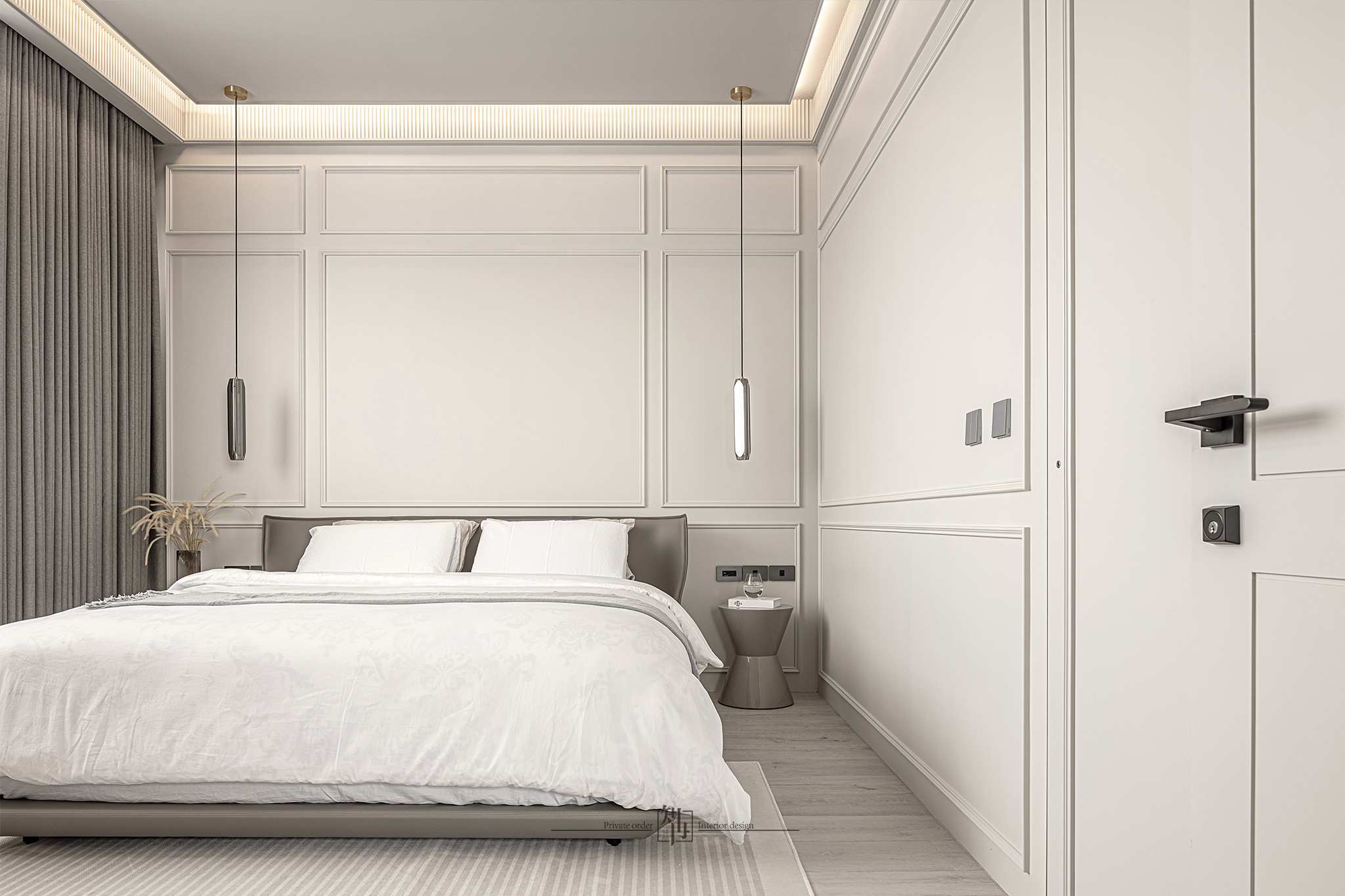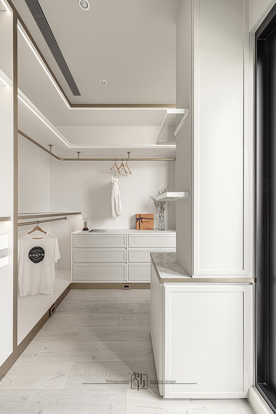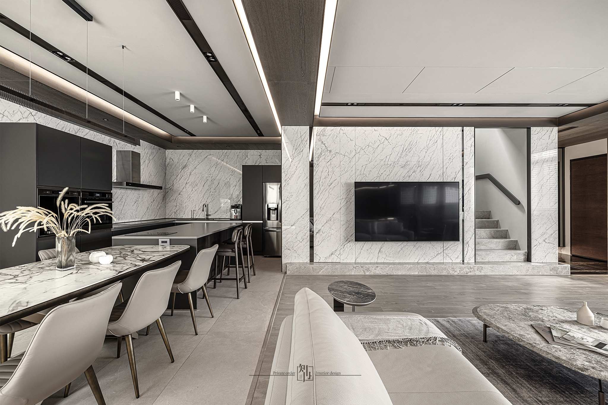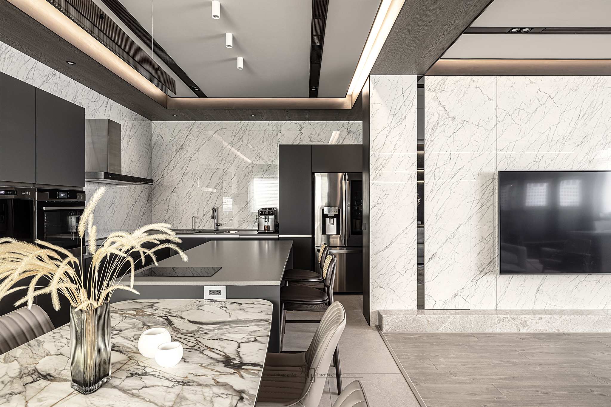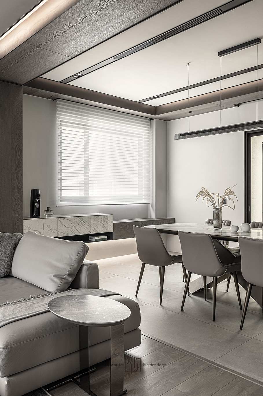此案為自地自建複合式住宅,業主本身為農產業,在規劃住宅空間方面除了住宅空間規劃外,還要規劃智能農產設備空間,在工作與生活中找到美的平衡點,並結合現代美學讓整體更有加分的效果;住宅的建築外觀極簡純粹,卻在走進家門時別有洞天,一脈奢雅大理石漫流淌開,依循著立面蔓延至客廳與餐廚,此案的業主對於風水格局非常講究,所以在空間規劃上也進行了許多調整,以樓梯定錨中心,將電視牆揉合其中,而第一段階梯則同步涵括平台用途,輔助上下樓也能擺放影音設備,相映對向,分別以工作桌、沙發與餐桌椅定義各場域,而本案的一大重點,即是設置養殖場的智能控制箱,其主要用途正是控制農舍養殖場的溫濕度、飼料與飲水等,在評估操作動線與美觀性後,捨棄原本以摺疊門修飾的作法,決定直接美化設備外觀,宛若化作設計元素之一,序列成辦公區域的背景,在業主不用出門的情況下,也能隨時關照養殖場的情況,在無形之中切分空間屬性,而工作桌則由大理石砌築而成,以此呼應電視牆設計,從細節串起公領域的一致性。拾級而上,將二樓歸屬於純粹的私領域,主要切分作:主臥室、客房、兒童房,也特別配置獨立衣物間,實現女主人的心之所願。針對主臥室設計則有別於公領域的沉斂氣息,以典雅線板堆疊優柔唯美氣質,佐以輕柔色調撫平思緒與疲倦,成為安放身心靈的溫暖歸所。客房、兒童房的設計,使用溫潤木質相映暖柔沙色,透顯一份日式的自然寧靜氣息,依序沿著空間輪廓訂製傢俱,勾勒簡單卻細膩的空間神情,並於轉角挹注圓弧語彙,成為一方自在角落。衛浴設計則以銀狐大理石的奢雅紋理落筆,搭配典雅線板砌築浴櫃,形塑出優柔的沐浴時光,根據業主夫妻倆的習慣,配置獨立浴缸與設置一對浴盆,既可沉浸於專屬於自我的時刻,也能在日常相伴不相擾。整體案子來說主要結合工作與日常,在多次進行調整後設計出風格整體性一致的設計,業主也感到滿意的作品,就是我們的榮幸。