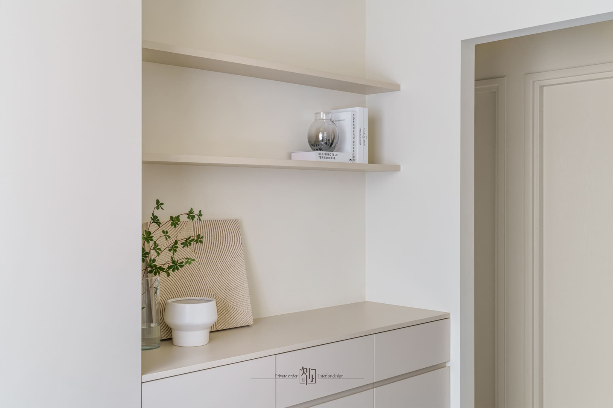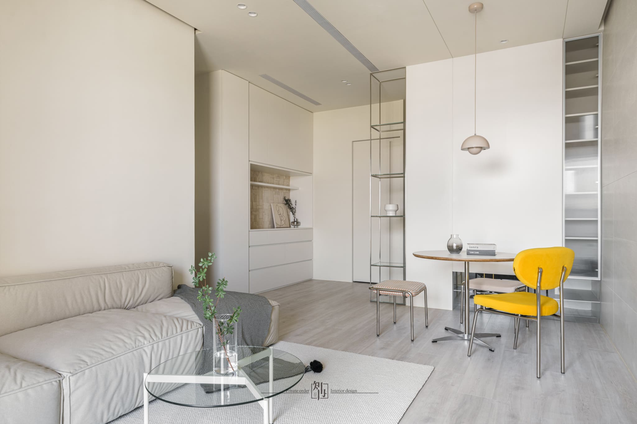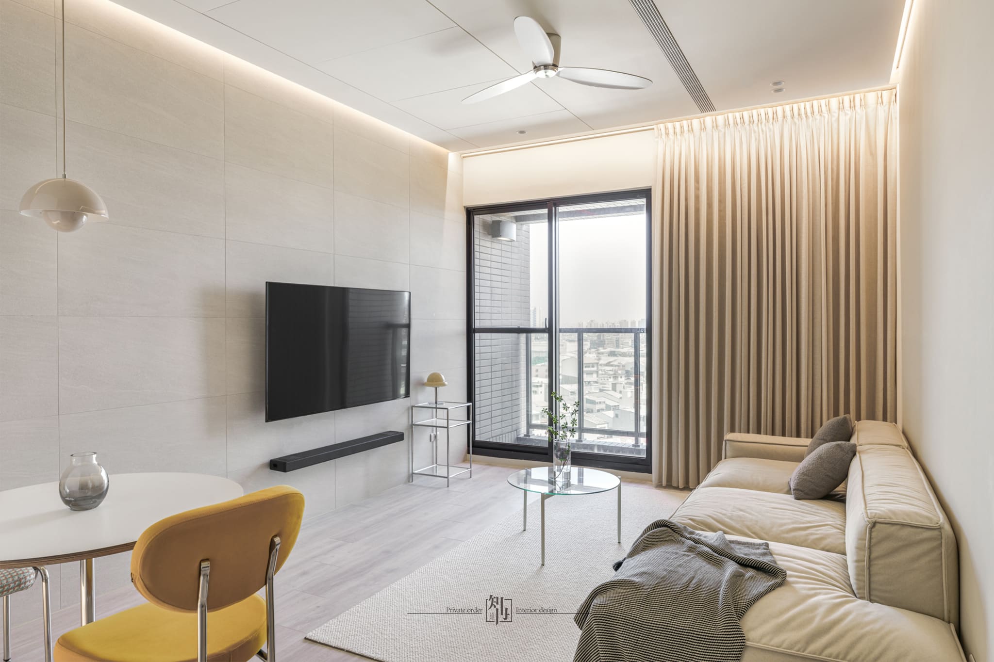 The large tiles on the TV wall exude a clean aesthetic that complements the delicate Korean-style accessories, creating a quaint and chic INS-style vibe. The space is grounded in a minimalist white palette, which not only amplifies the sense of space but also provides a serene visual resting place. The specially selected furniture pieces are unique, adding a touch of warmth to the milk tea-hued space and bringing subtle changes and richness to the area.