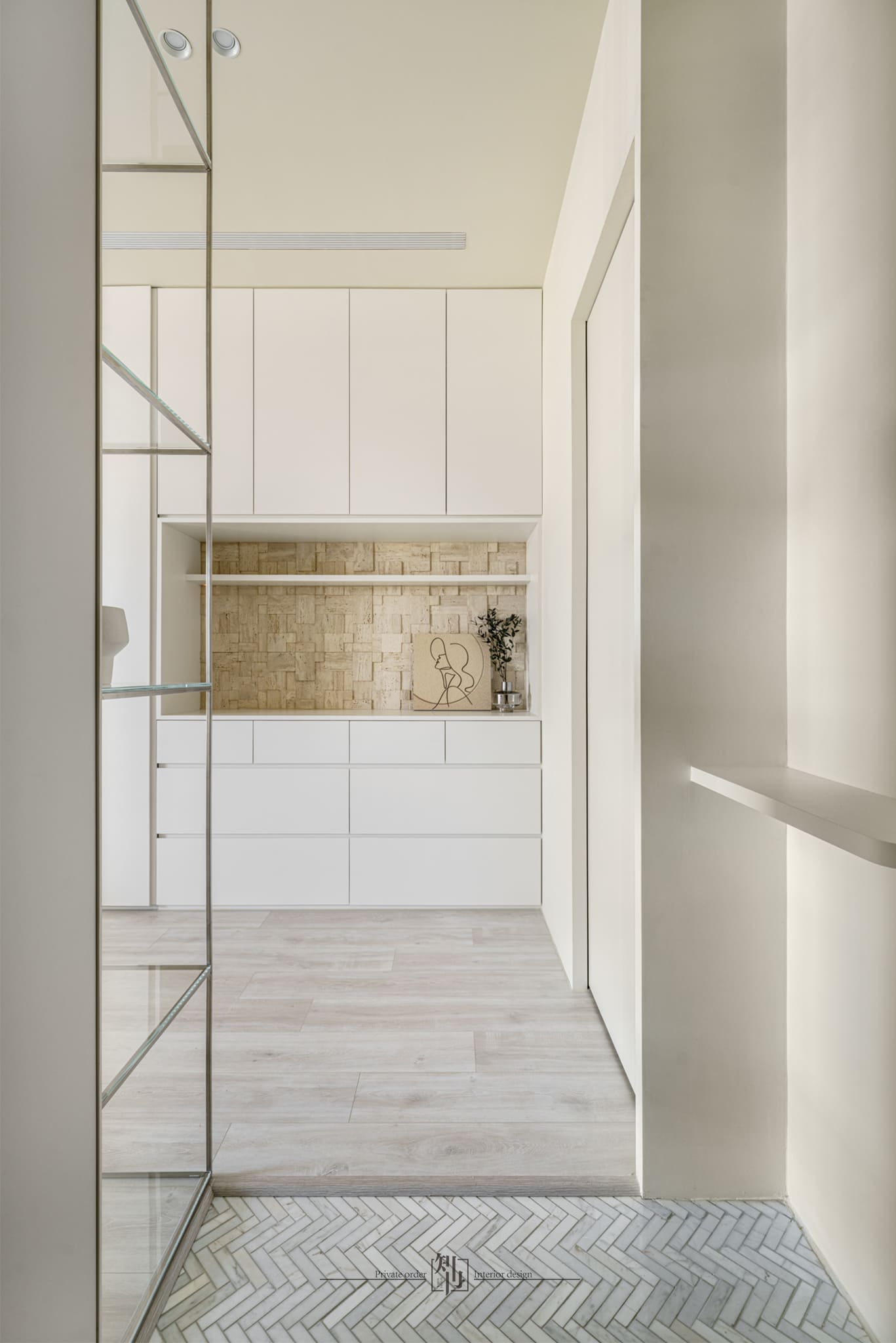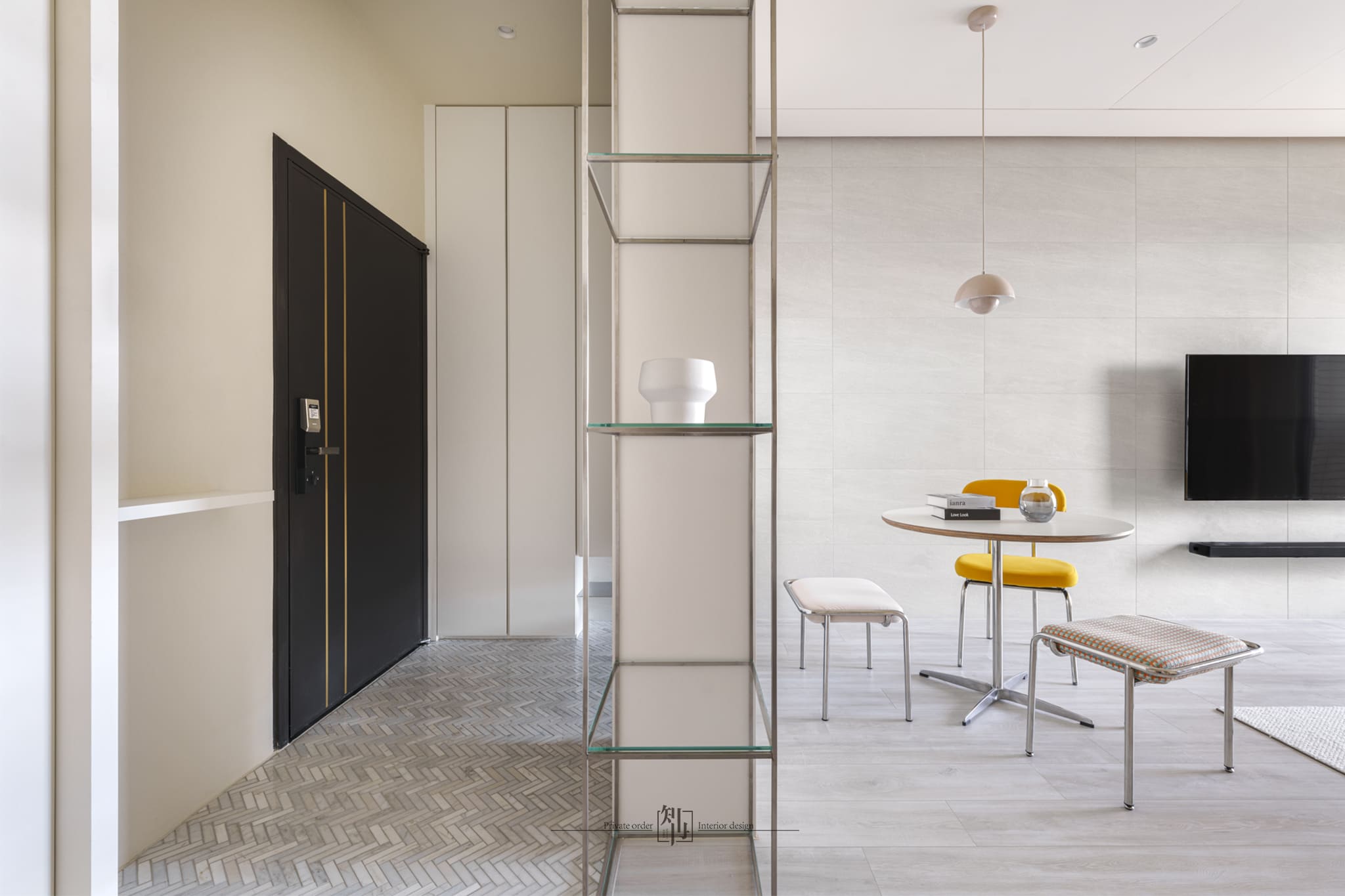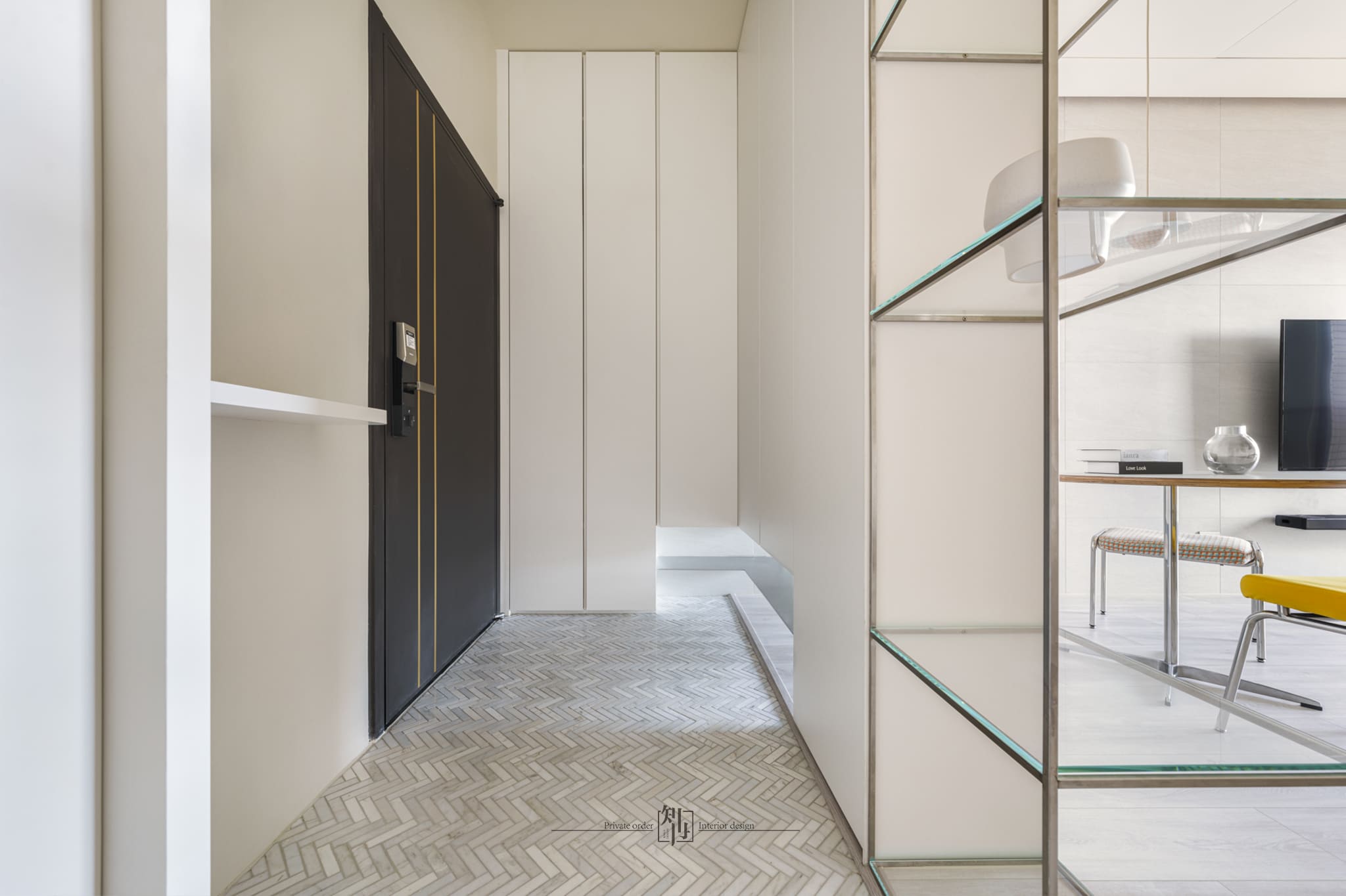 玄關地面選用了馬賽克磁磚,以其獨有的圖案和質感立即吸引視線,這不僅是對空間的第一印象,也是對品味的第一展現。不同材質的交錯使用磁磚的現代感、木地板的溫暖質樸、塗料的純淨感、馬賽克的藝術性、大理石的優雅與金屬元素的現代工藝共同編織出一場視覺和觸感的盛宴。