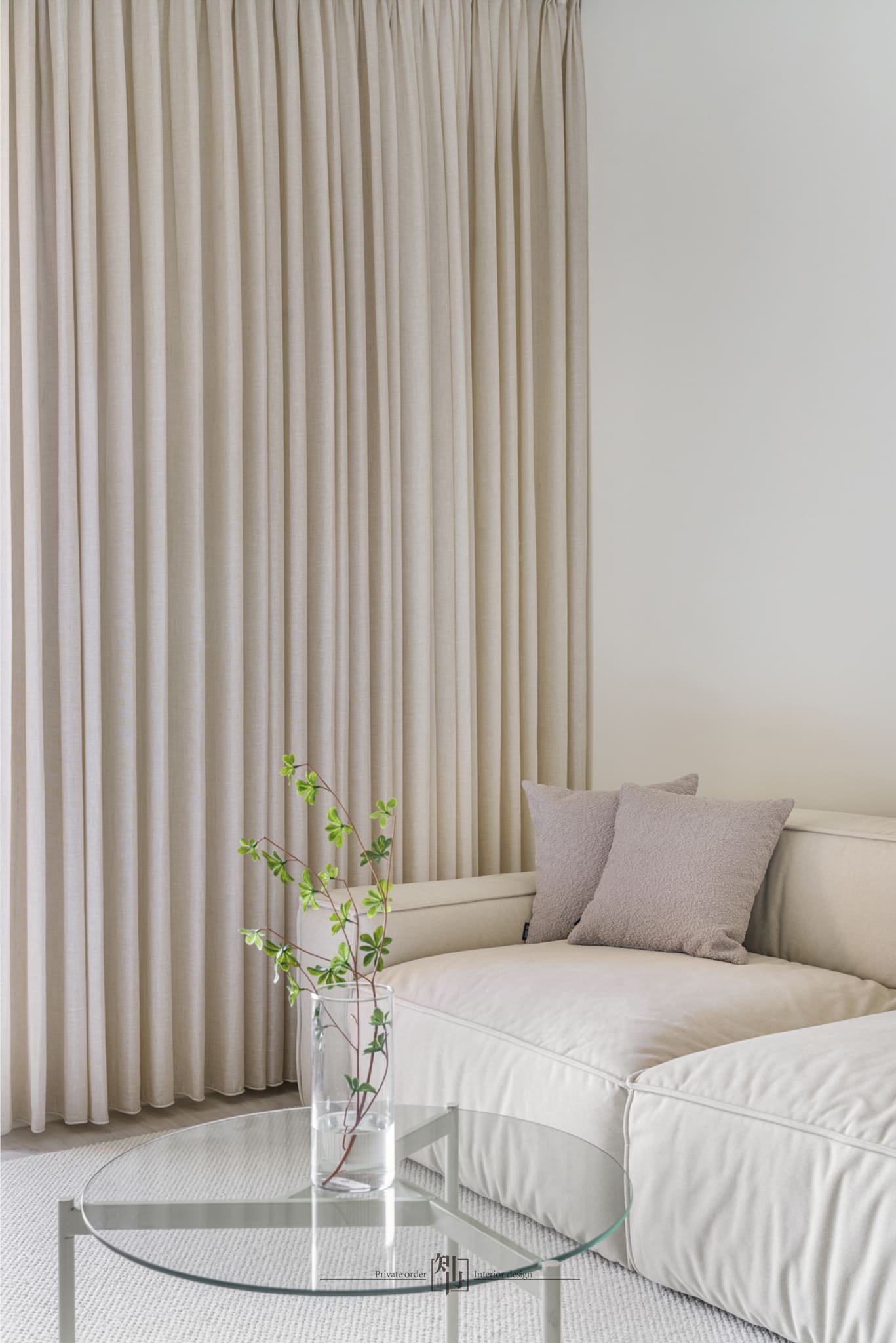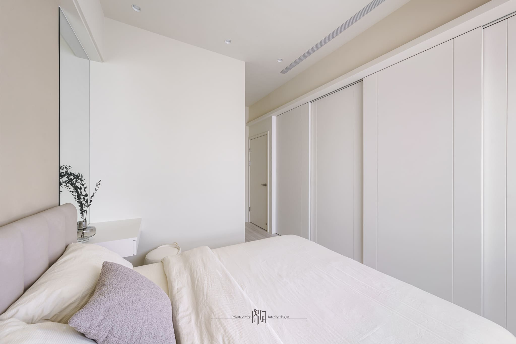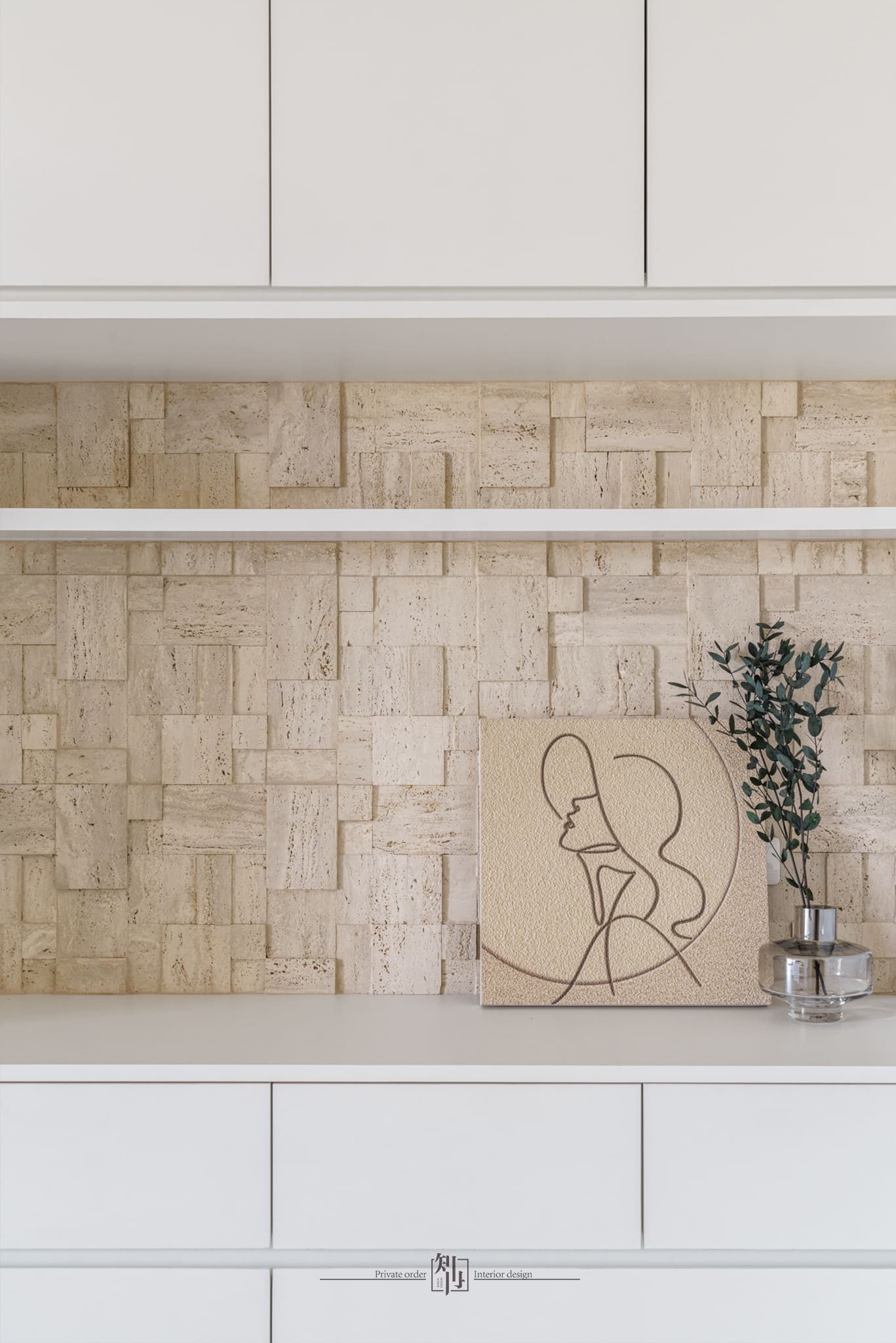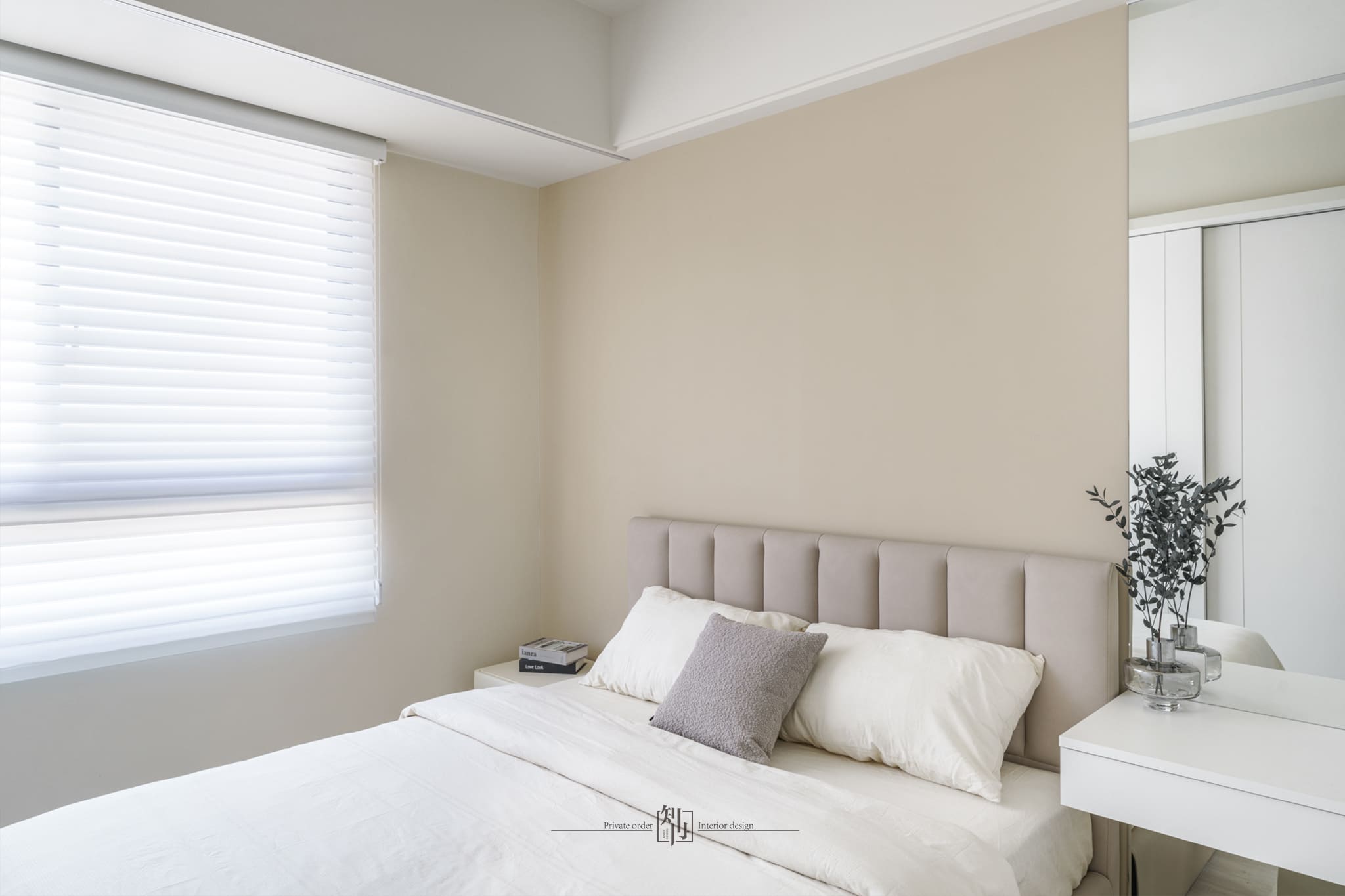 電視牆面的大面積磁磚呈現了簡潔的美學,與韓風的精緻小品相得益彰,塑造出一種INS風格的小巧精致。整體空間以簡約的白色調為基底,不僅放大了空間感,也提供了一個平靜的視覺休憩地。特別挑選的家具件件獨特,它們在奶茶色調中增添了幾分溫暖,也為空間帶來了微妙的變化和豐富性。