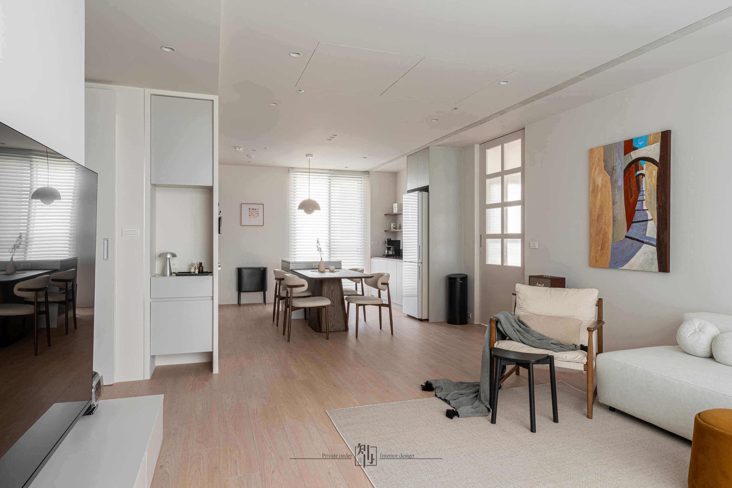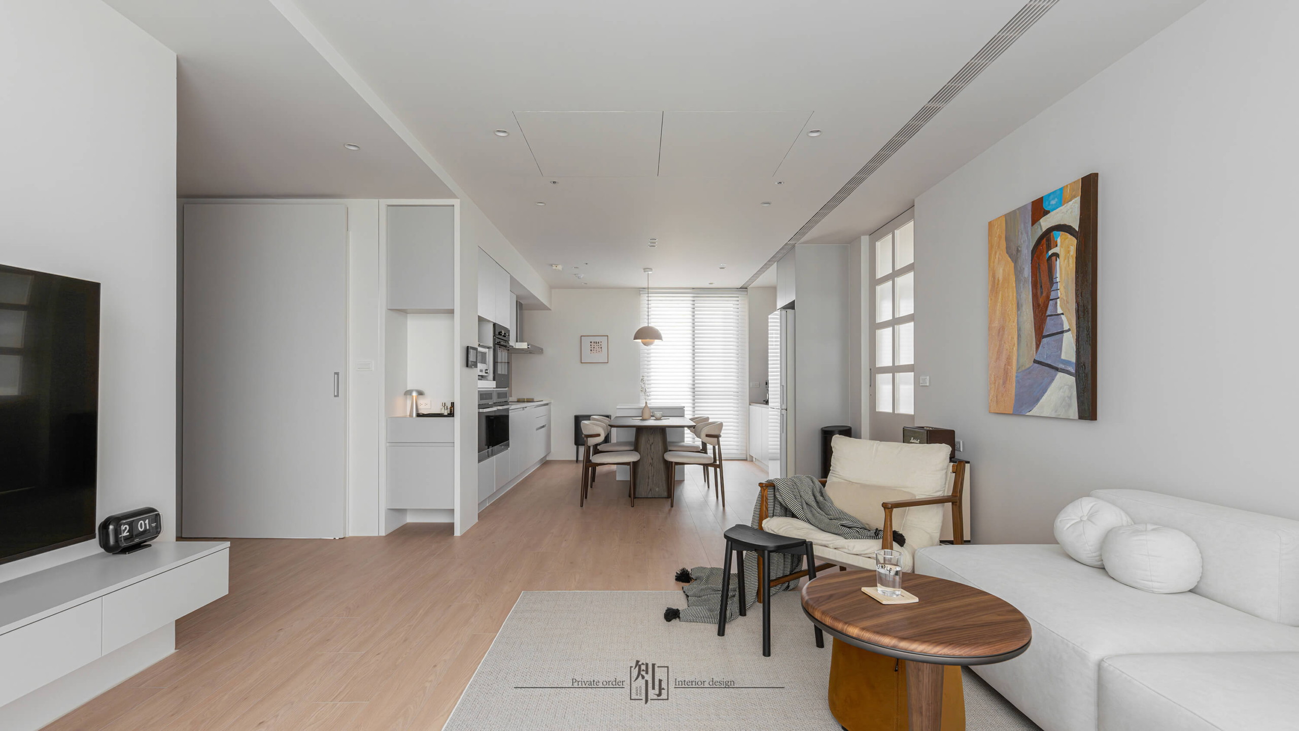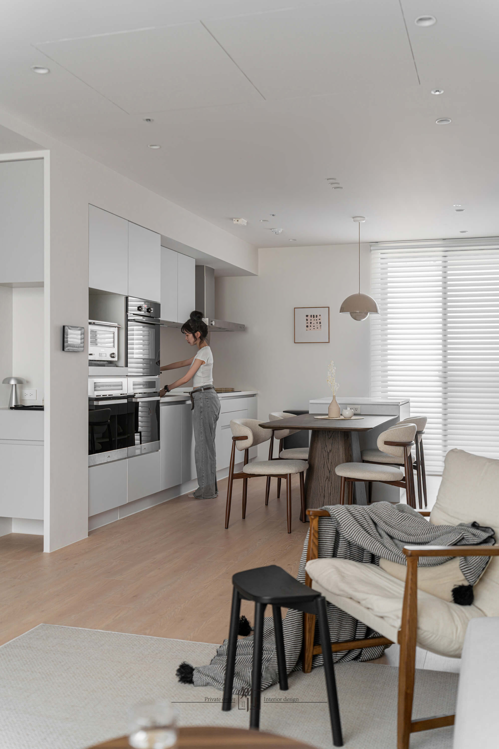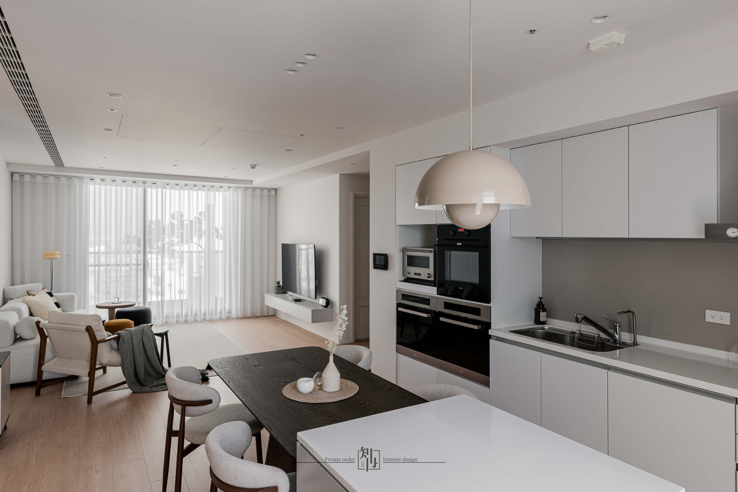 The kitchen and dining space continue the sense of purity, with integrated cabinetry and concealed storage that keep the visual field uncluttered. White cabinets pair with light wood dining chairs, while a warm-toned pendant lamp sets an inviting mood. The open-plan layout allows cooking and dining to flow naturally, extending both interaction and spatial depth.