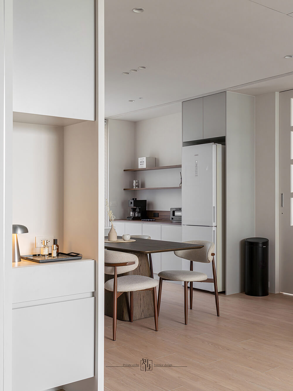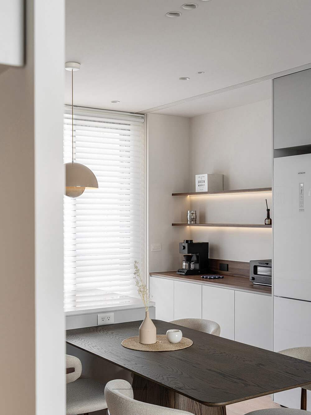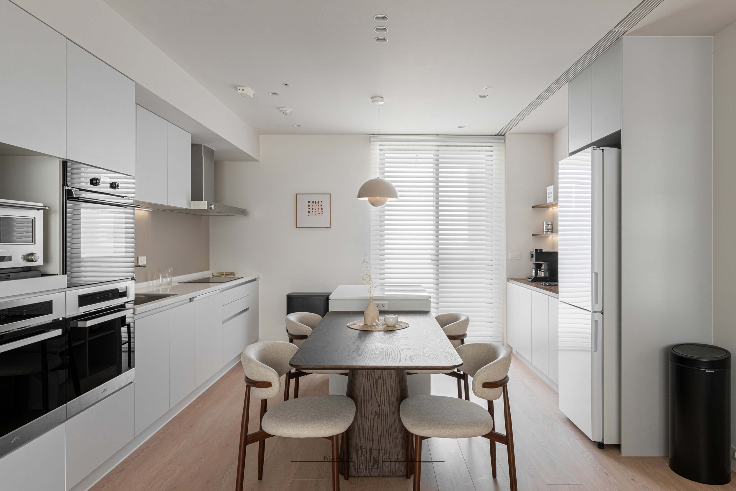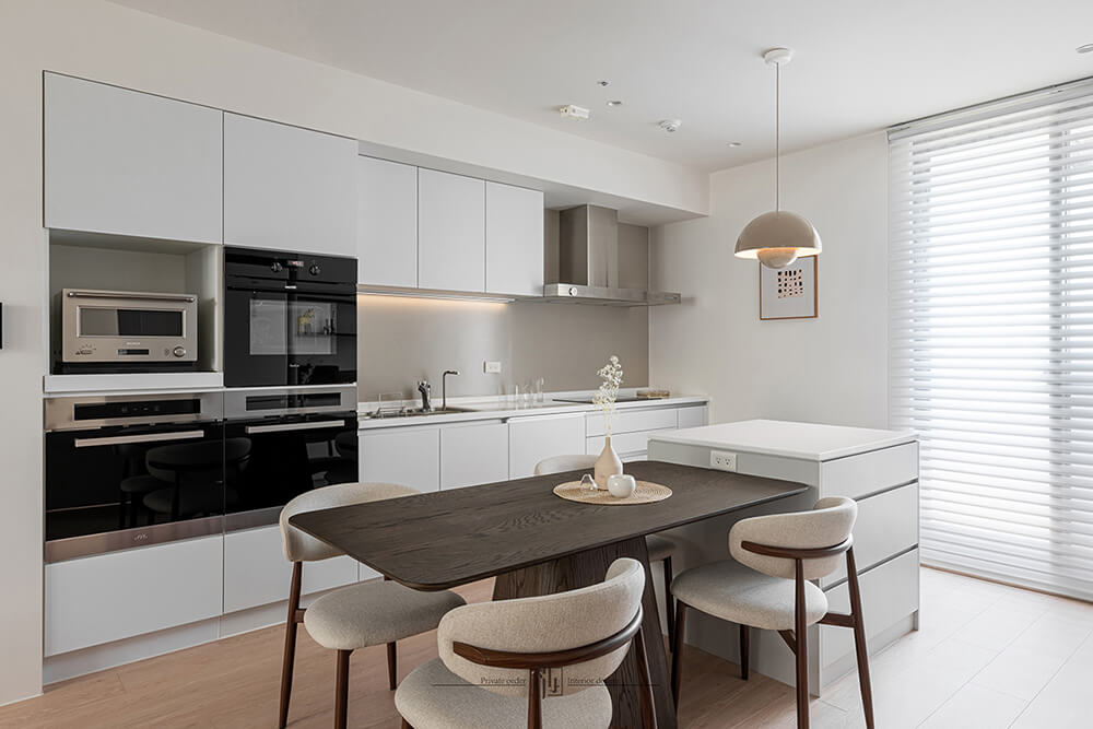 餐廚區延續了純淨基調,整合式廚具與隱藏收納保持視覺簡潔。白色櫥櫃搭配淺木色餐桌椅,暖色吊燈垂落其間,營造出柔和的用餐氛圍。開放式布局讓烹飪與用餐的互動自然流暢,同時延伸了空間感。