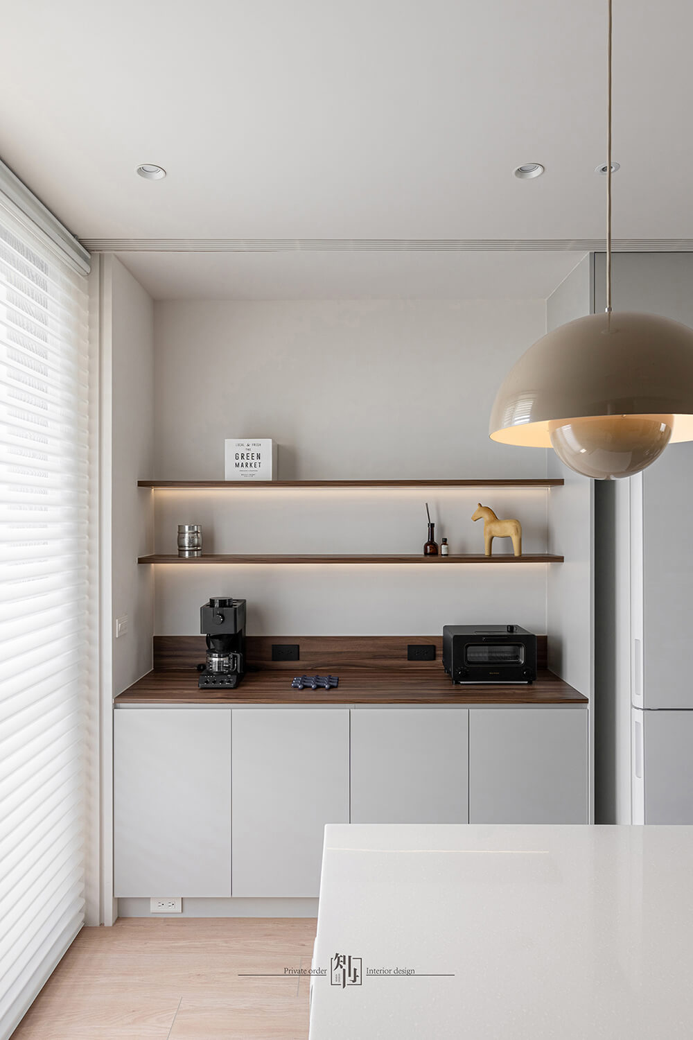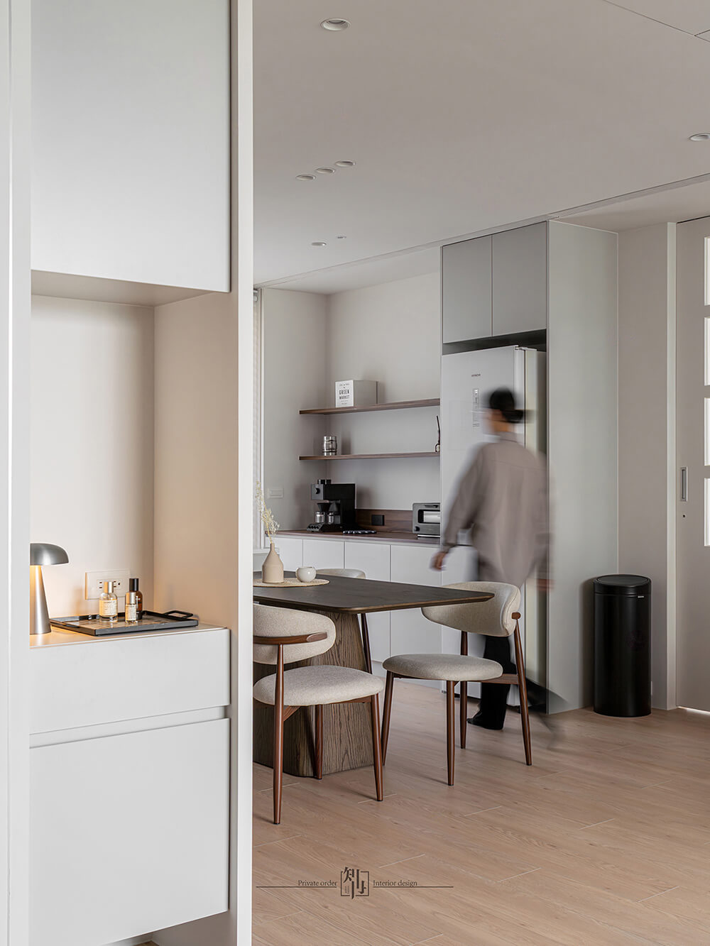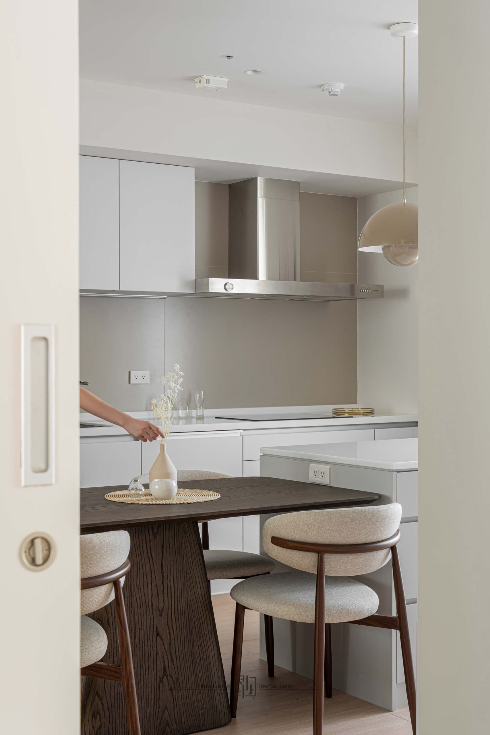 餐廚區延續了純淨基調,整合式廚具與隱藏收納保持視覺簡潔。白色櫥櫃搭配淺木色餐桌椅,暖色吊燈垂落其間,營造出柔和的用餐氛圍。開放式布局讓烹飪與用餐的互動自然流暢,同時延伸了空間感。