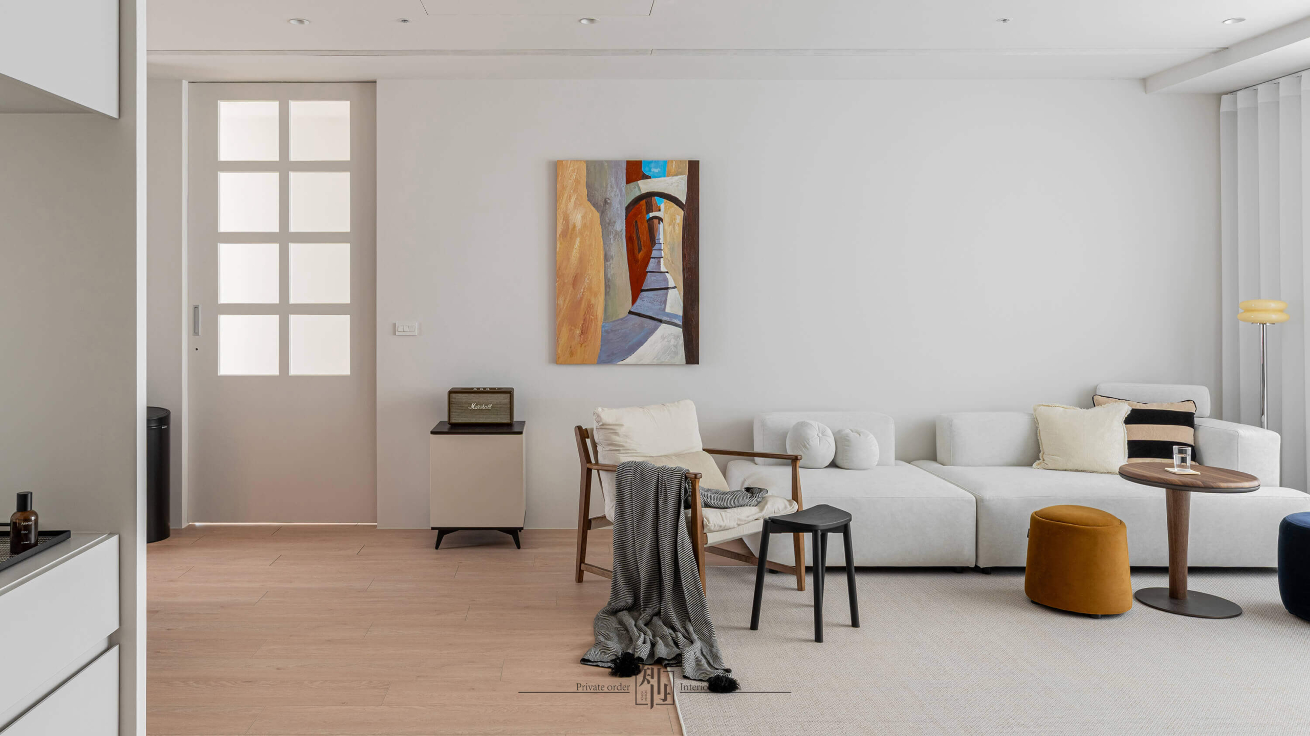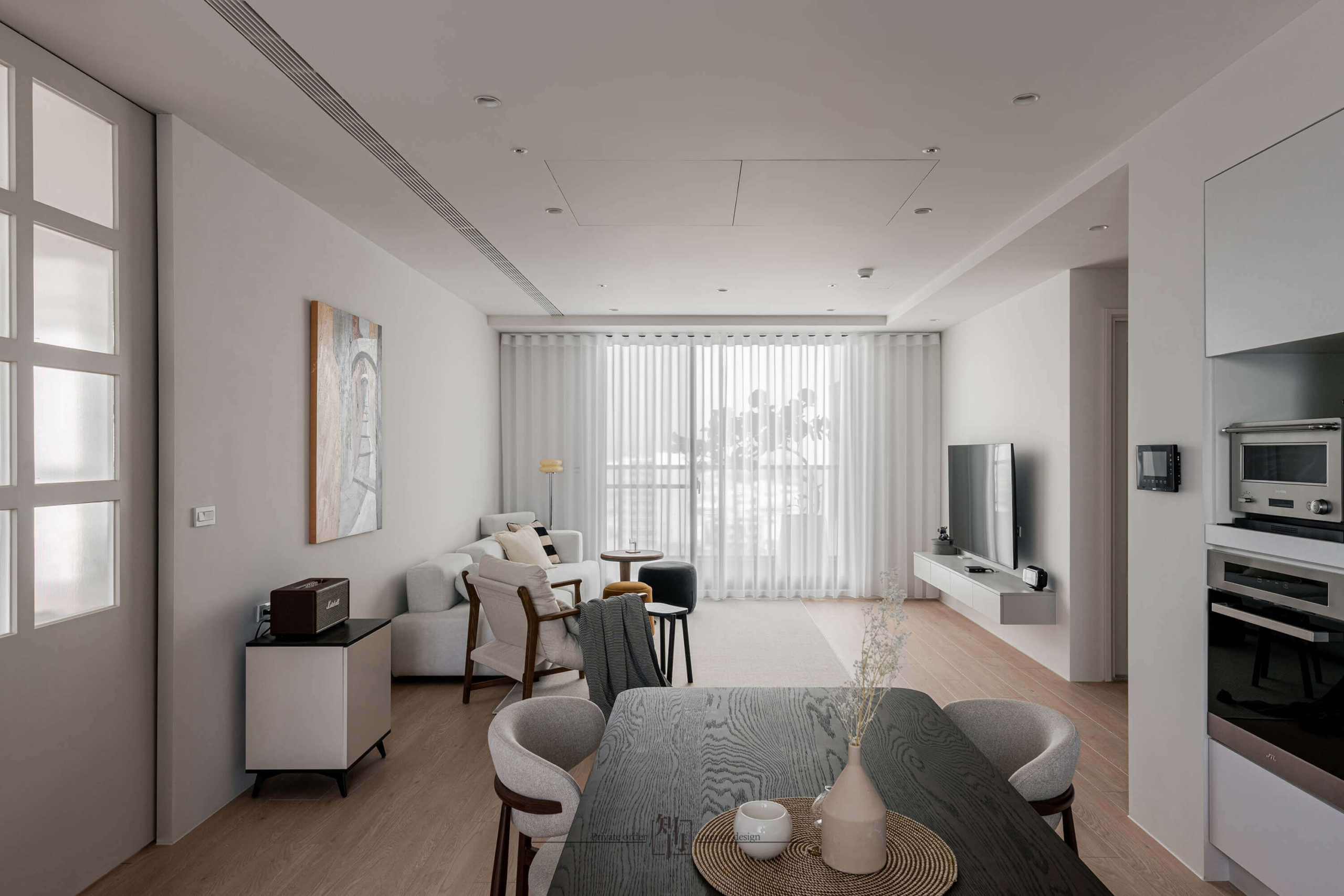 客廳以柔和的白色布簾引入自然光,將室外景致化作日常的一部分。淺色沙發、木質單椅與低彩度軟件共同構築靜謐氛圍,深藍、芥黃等小面積色彩的點綴,讓平和中暗藏律動。牆上的抽象畫作與極簡家具相互呼應,為空間增添藝術感與層次。