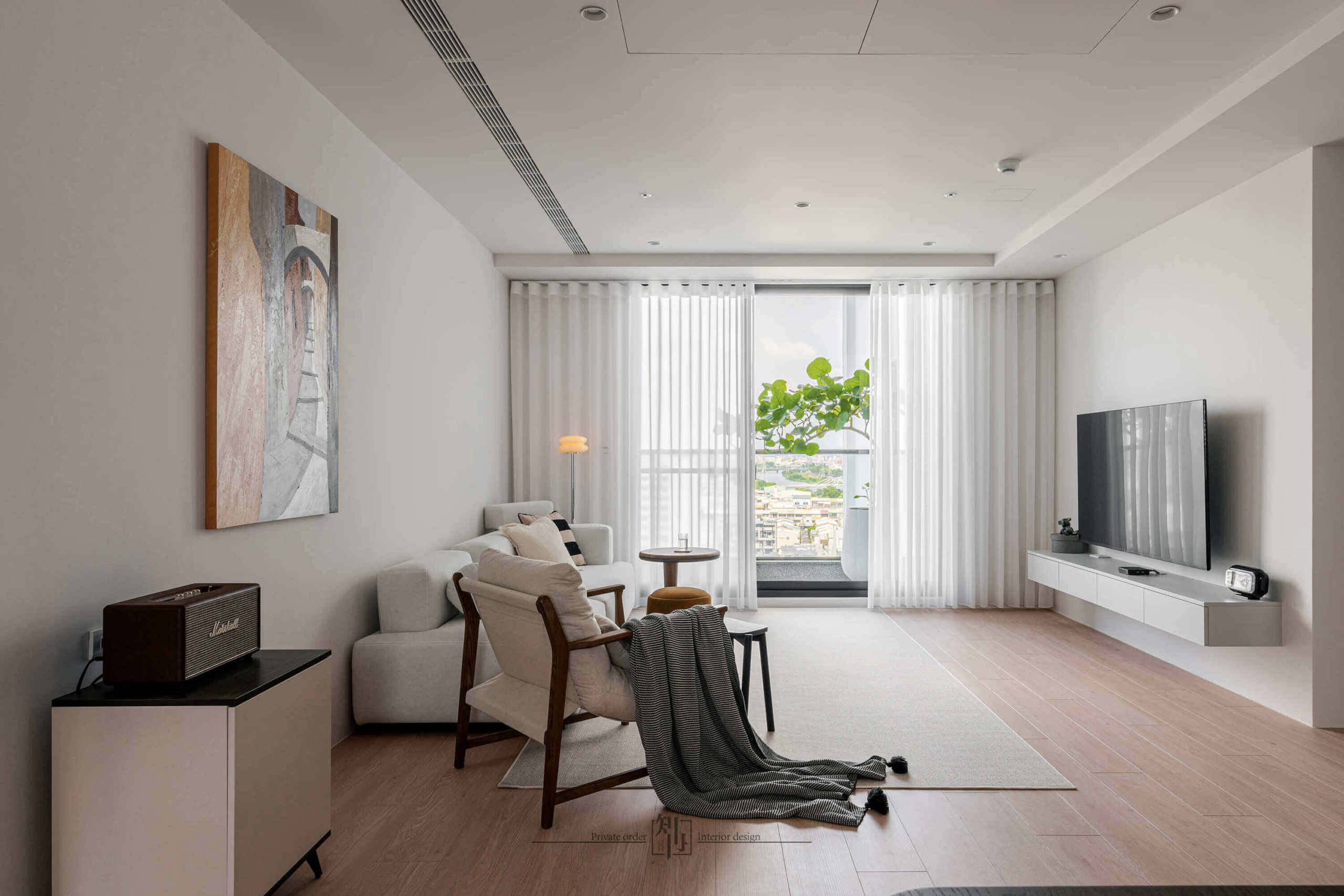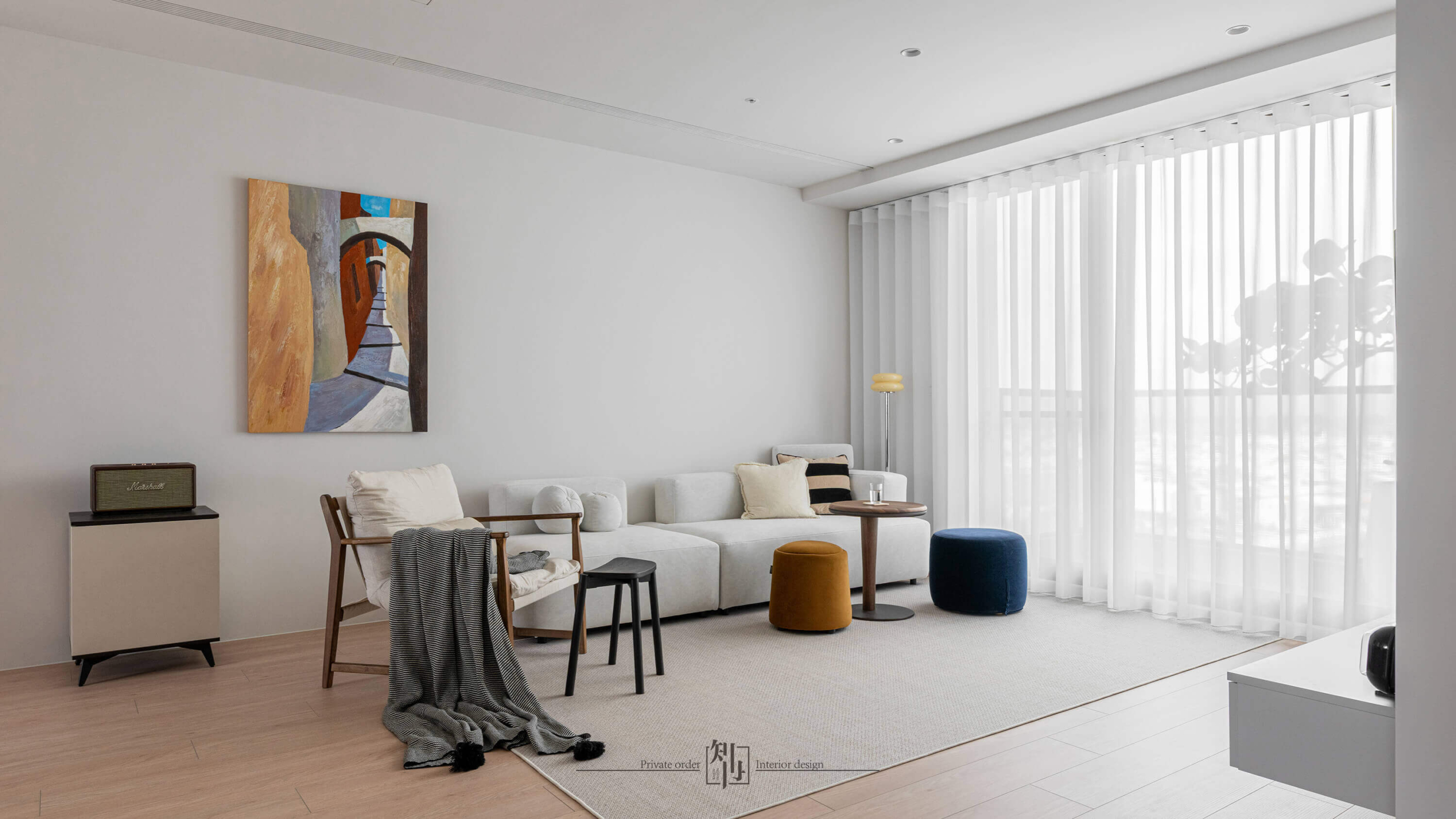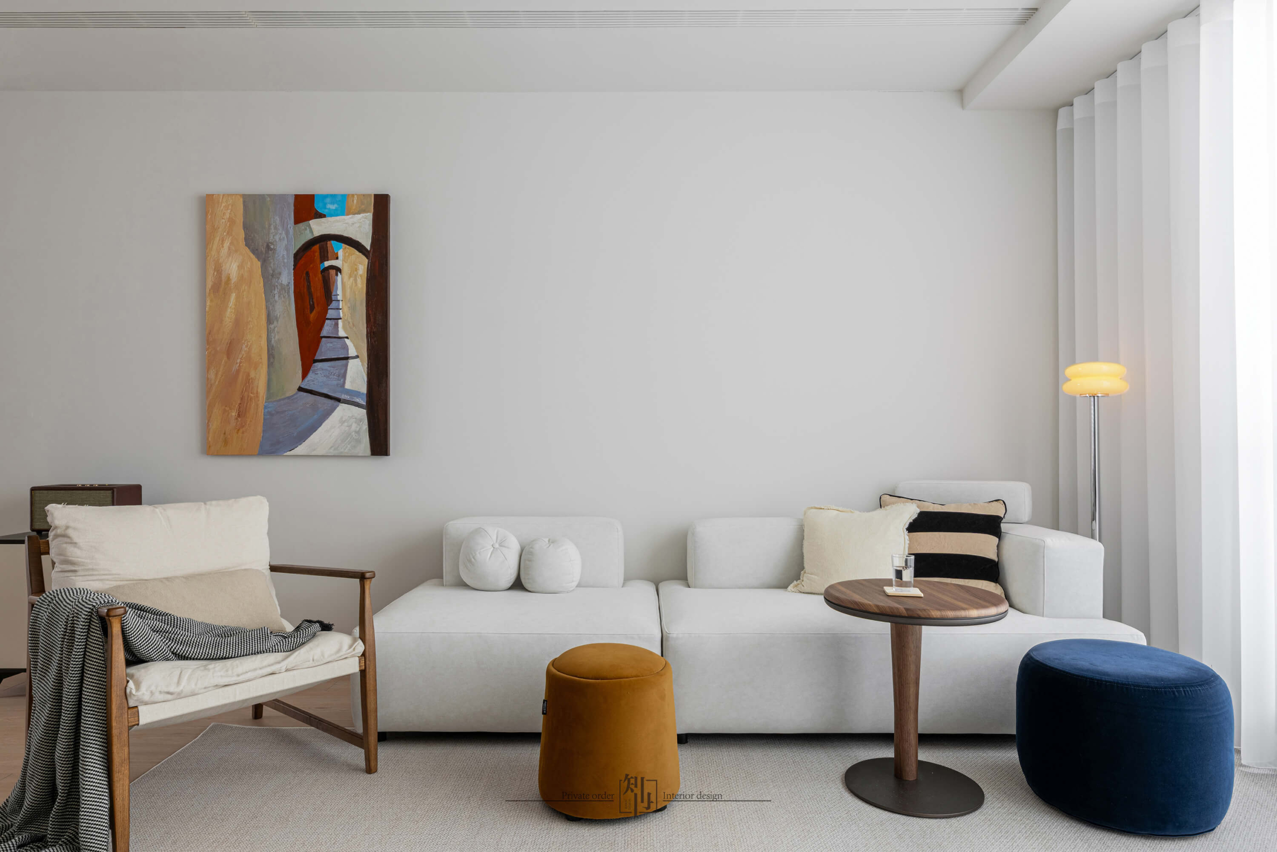 In the living area, soft white drapery filters daylight, drawing the outside view seamlessly into the daily rhythm. A pale-toned sofa, wooden armchair, and muted accents compose a calm atmosphere, while subtle touches of deep blue and ochre bring quiet energy to the palette. An abstract artwork on the wall echoes the furniture’s clean geometry, adding an understated layer of artistry.