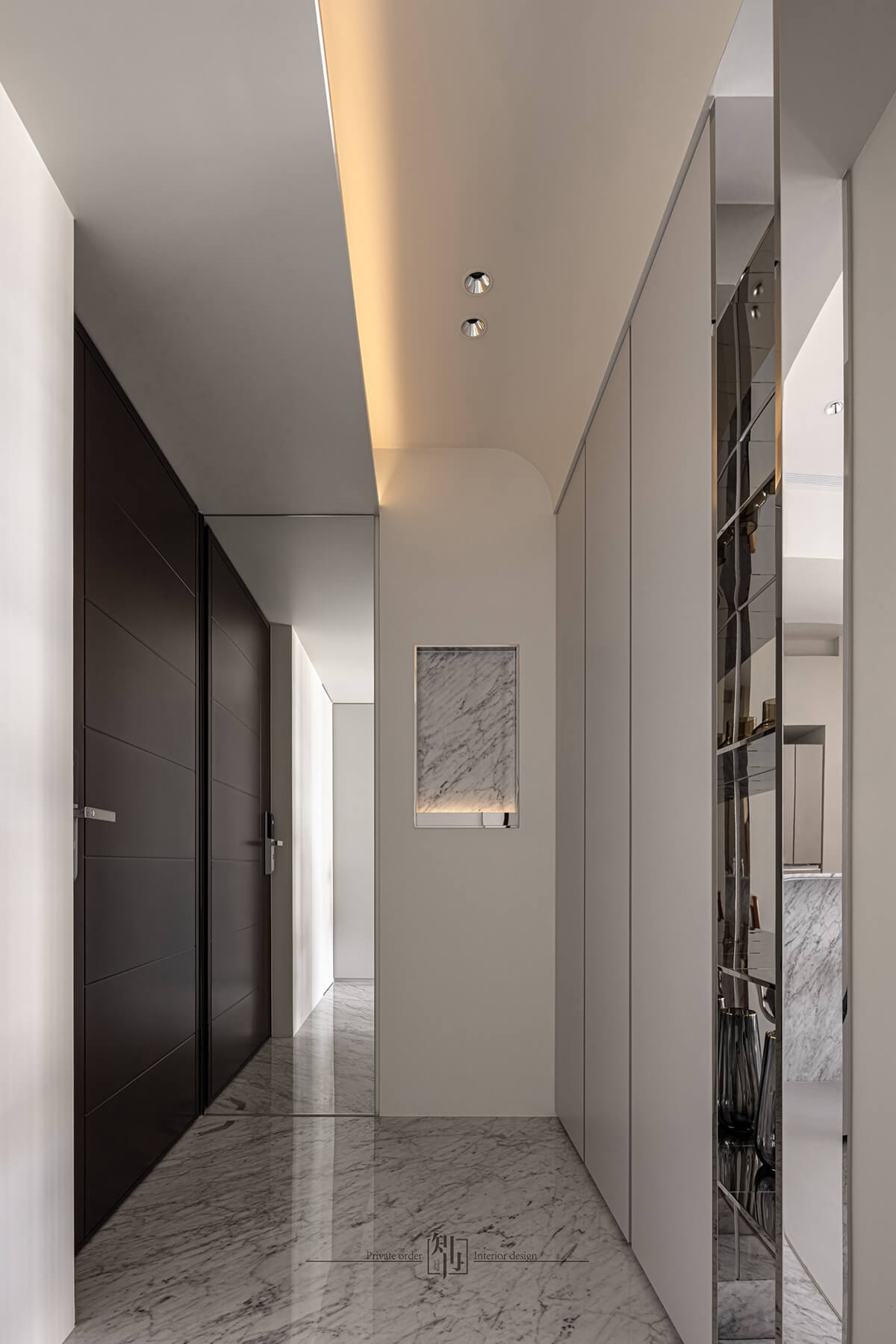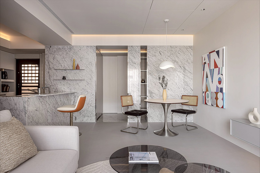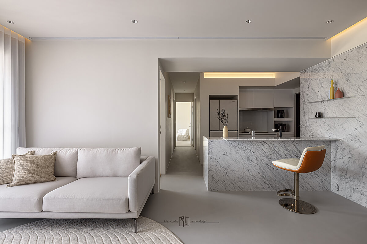 基調以白與淺灰鋪陳,像一張潔淨的紙張,等待生活書寫其上。大理石牆面與中島的紋理,冷靜卻有力量,不是炫耀性的材質,而是靜默的框架,讓人時時記得生活需要穩定的支點。當陽光透過紗簾流動,時間感在石紋與陰影中被悄然拉長。