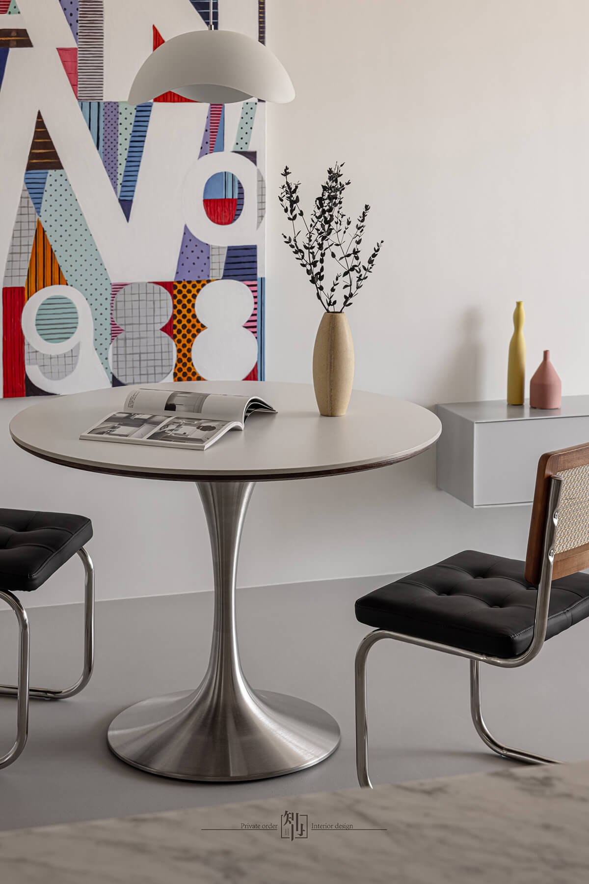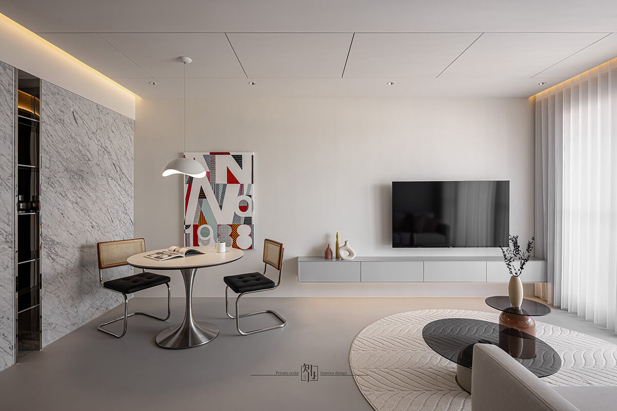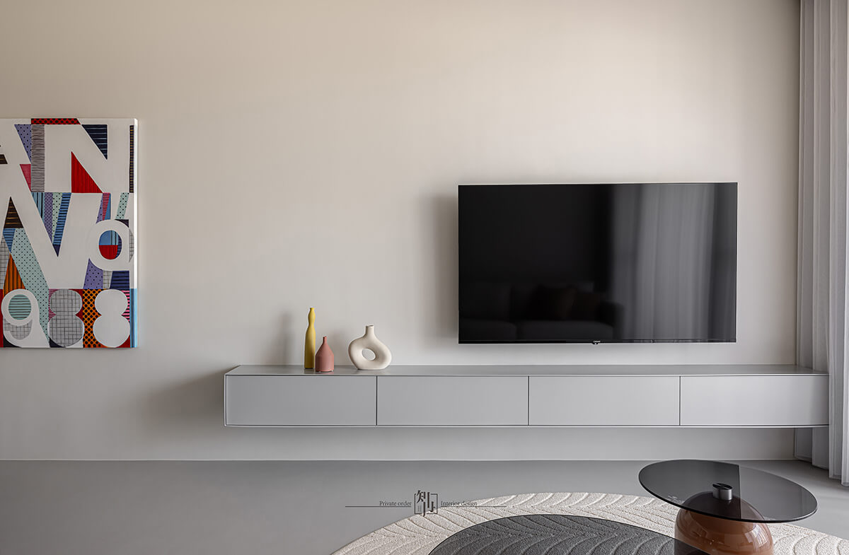 客廳以圓形地毯界定核心,玻璃茶几的幾何層次,使空間在理性之間仍留有柔軟迴響。電視牆選擇懸浮式櫃體與大面留白,讓光線與陰影成為真正的裝飾。牆上的藝術畫作以鮮明色塊打破沉靜,像生活中的一抹不經意的驚喜,提醒我們在秩序裡,也要容納隨性與跳動。