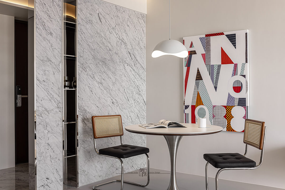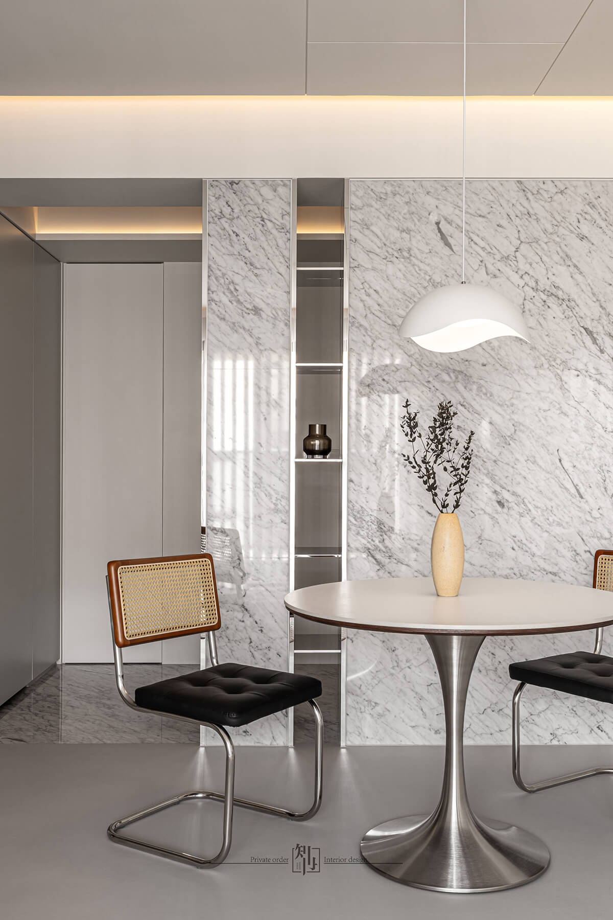 餐區則是一種輕盈的表達。藤編椅、圓桌與懸吊燈,形成現代與懷舊的交錯;大理石延伸至中島,將烹飪轉化為生活儀式,而非單純的日常瑣碎。當燈光落下,餐桌不僅是進食的地方,更是交流與陪伴的舞台。