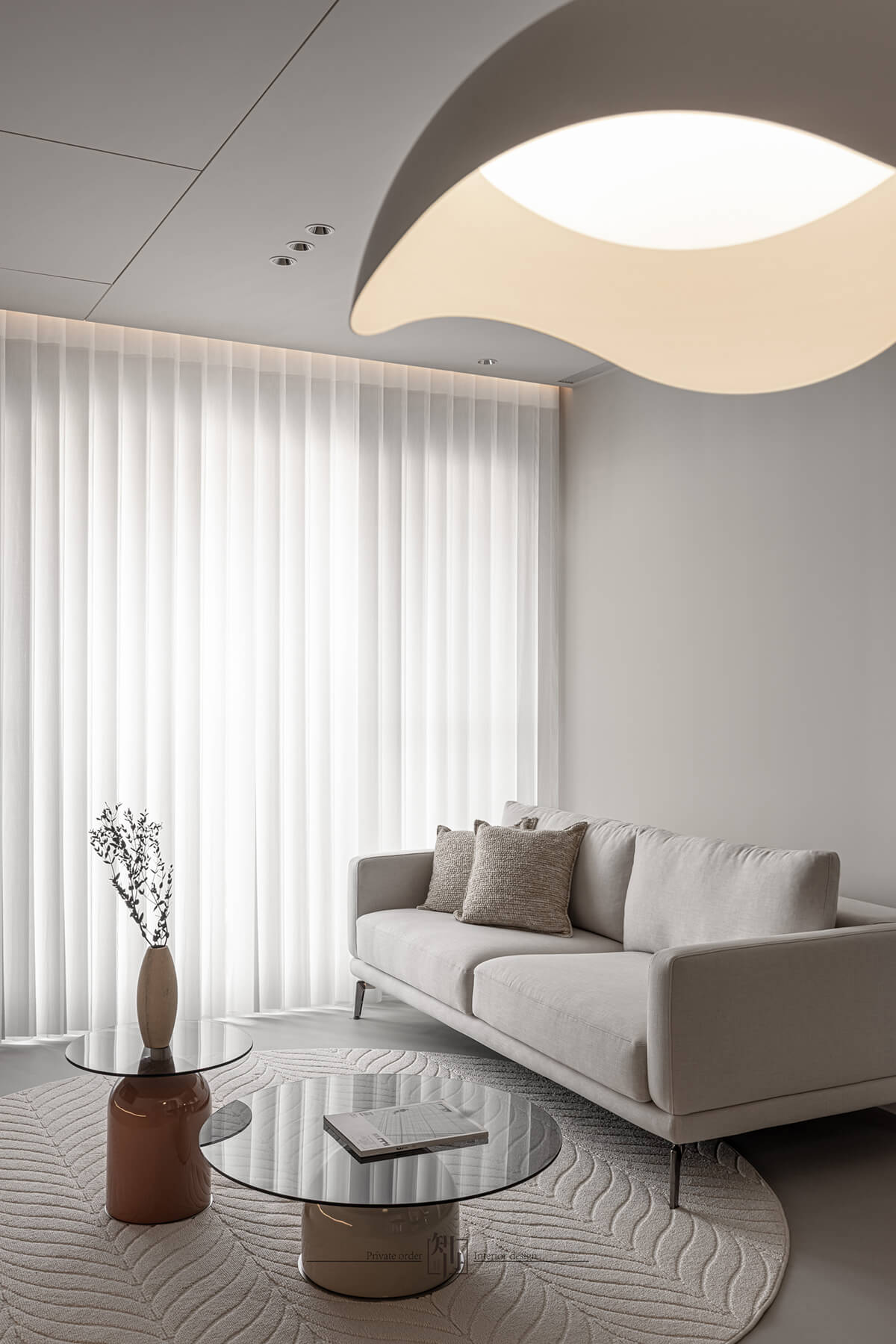 The living room is defined by a circular rug and layered glass tables, softening geometry with warmth. The floating cabinet and blank TV wall resist ornamentation, allowing light and shadow to become the true adornments. A vivid artwork interrupts the calm, injecting spontaneity into order—just as life demands moments of unpredictability.