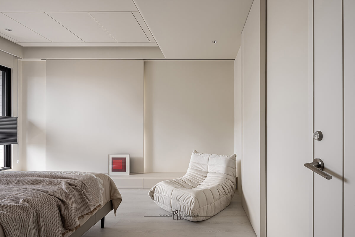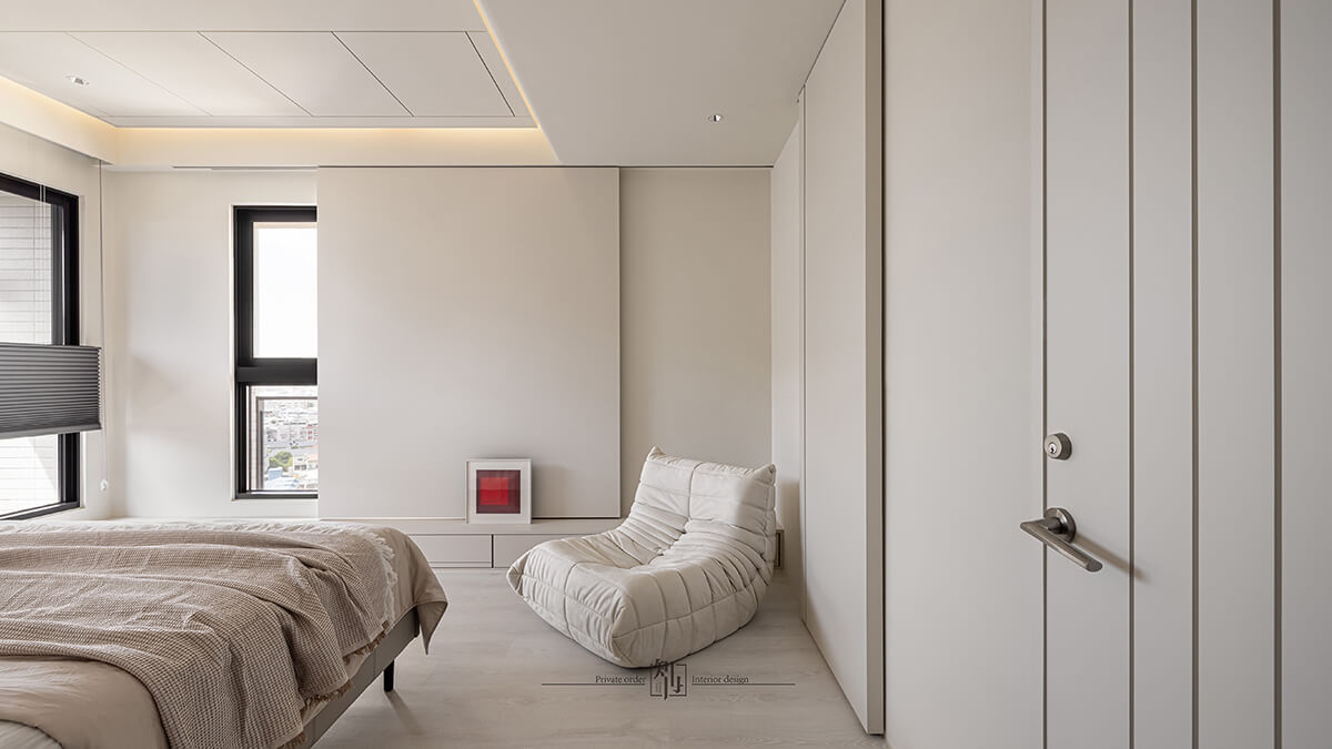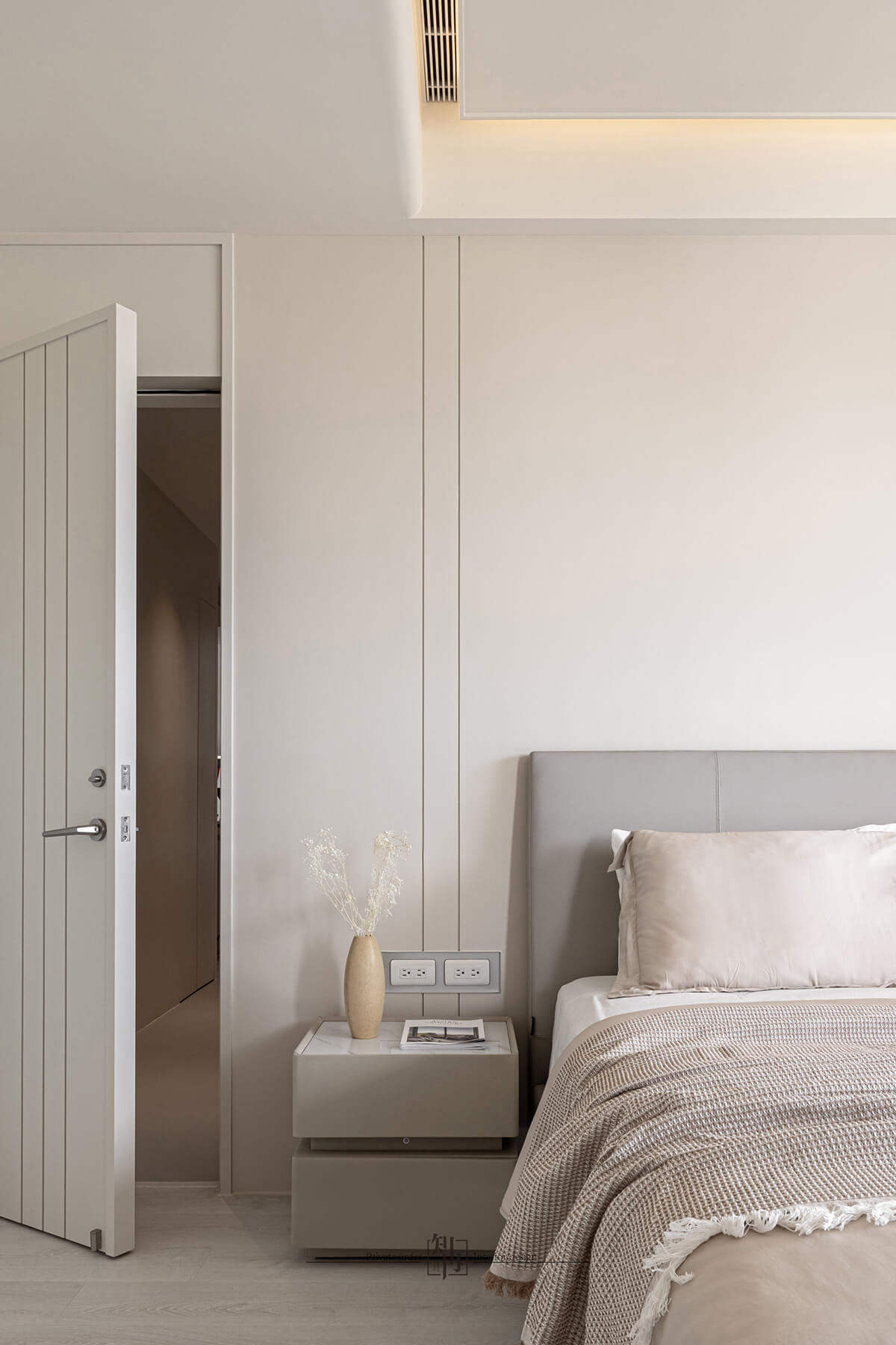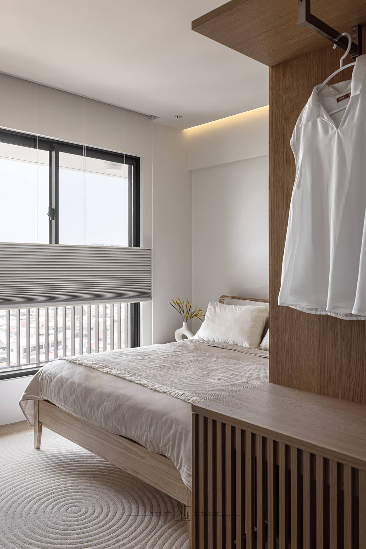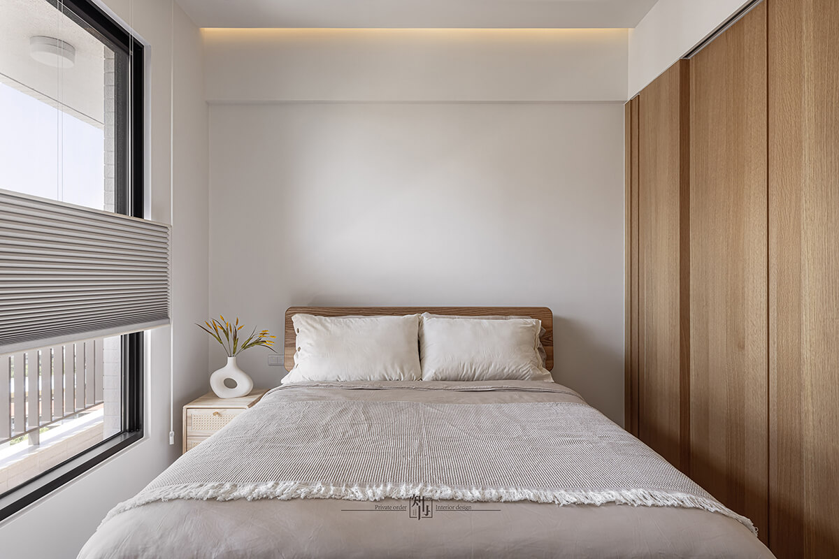 臥室則以木質櫃體、柔光與棉麻觸感延續安定感。白色寢具在光影中顯得輕盈,不需要多餘的語言,就能傳達親密與真實。夜晚降臨時,這份安靜比白晝更具厚度,像一種溫柔的庇護。