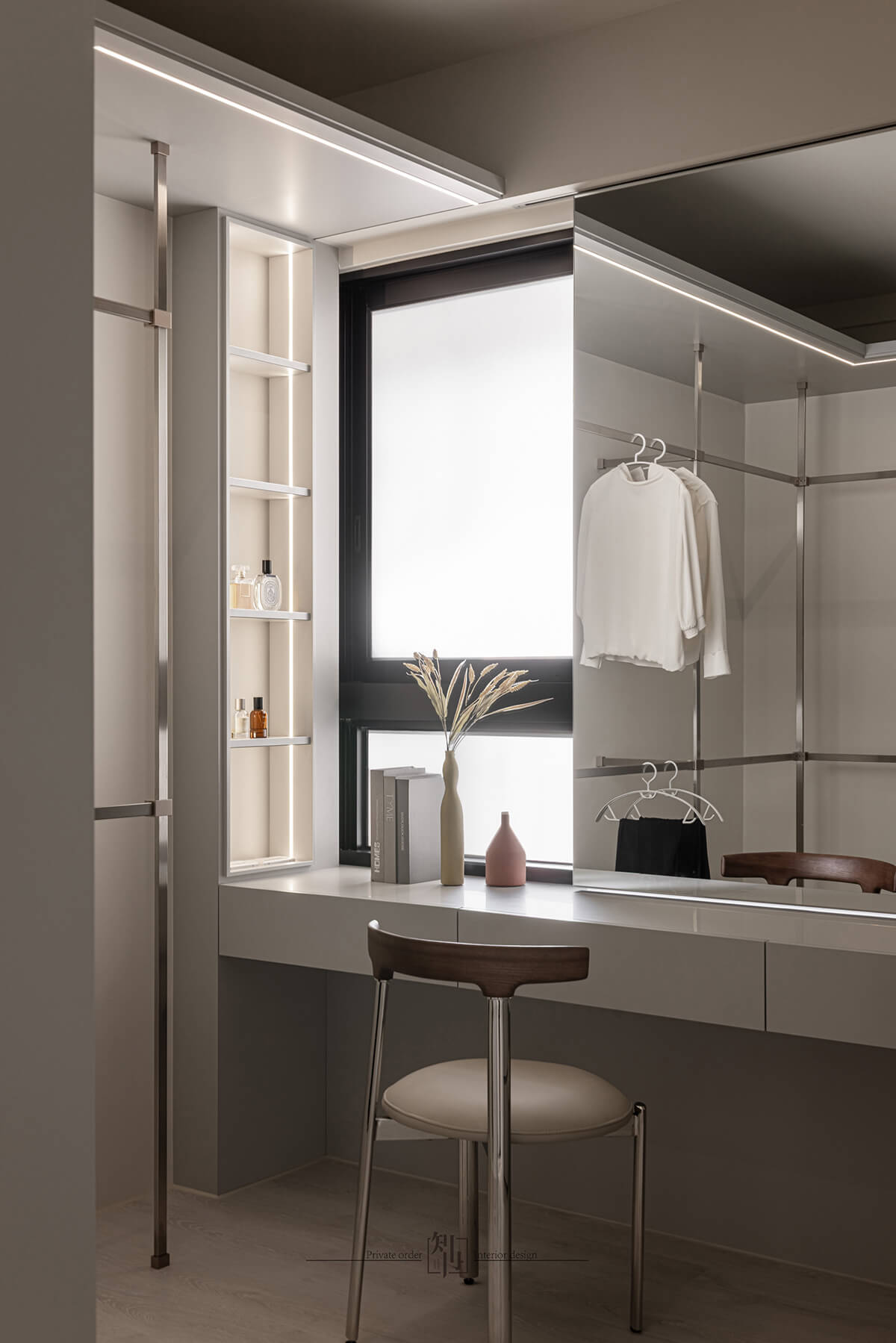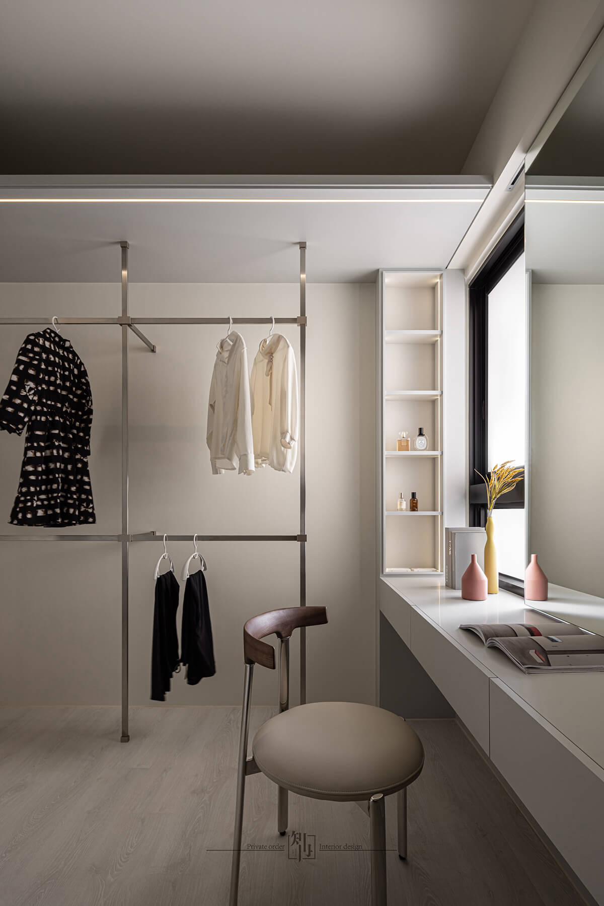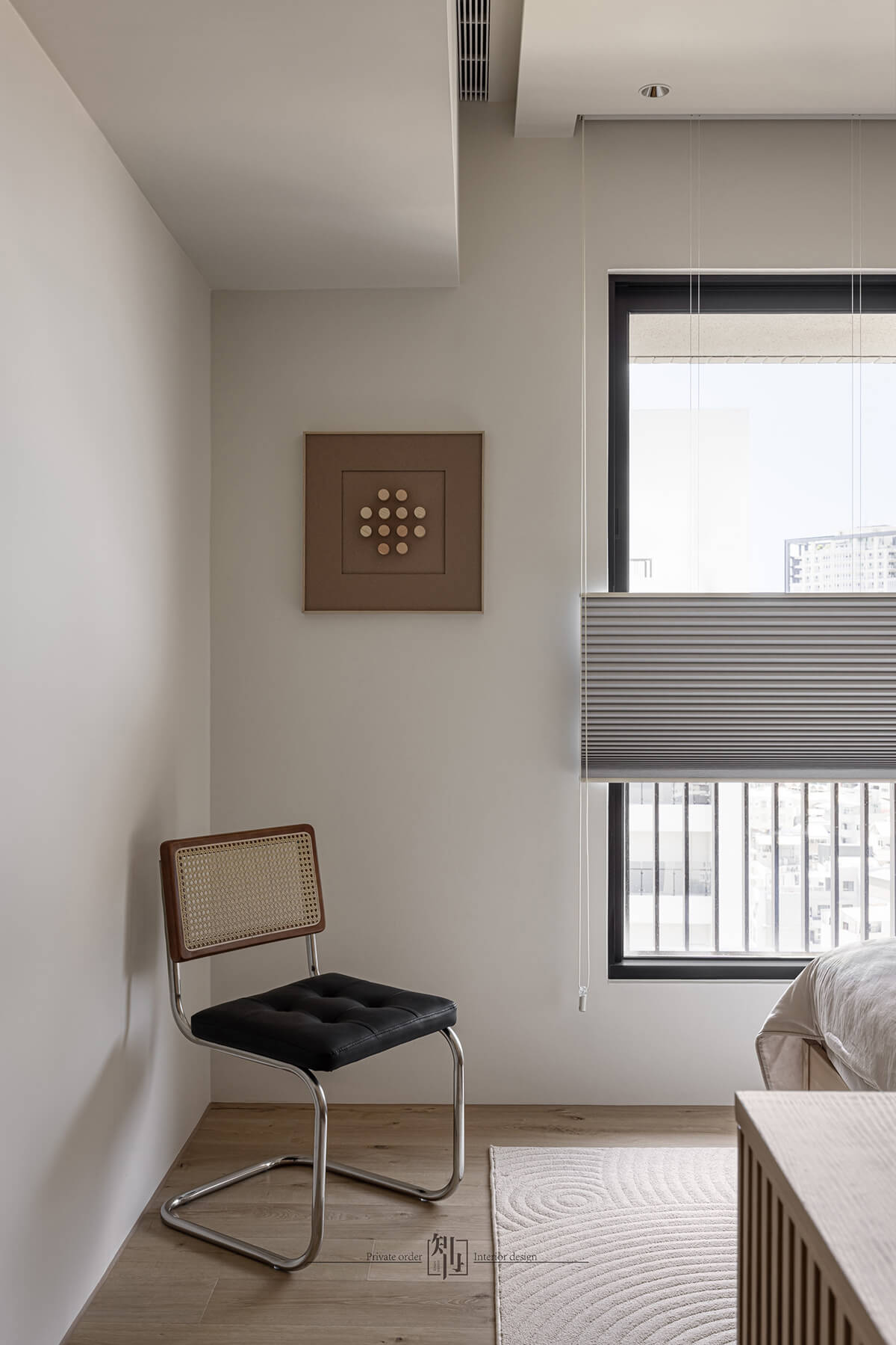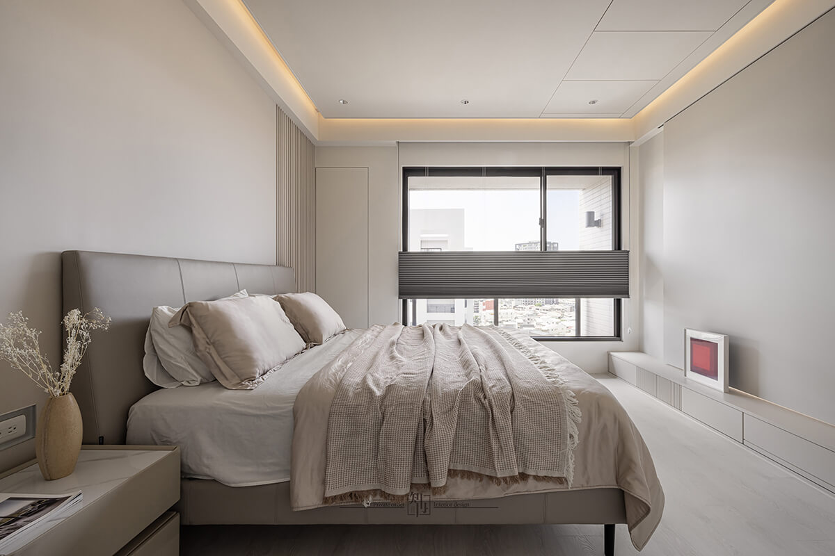 臥室則以木質櫃體、柔光與棉麻觸感延續安定感。白色寢具在光影中顯得輕盈,不需要多餘的語言,就能傳達親密與真實。夜晚降臨時,這份安靜比白晝更具厚度,像一種溫柔的庇護。