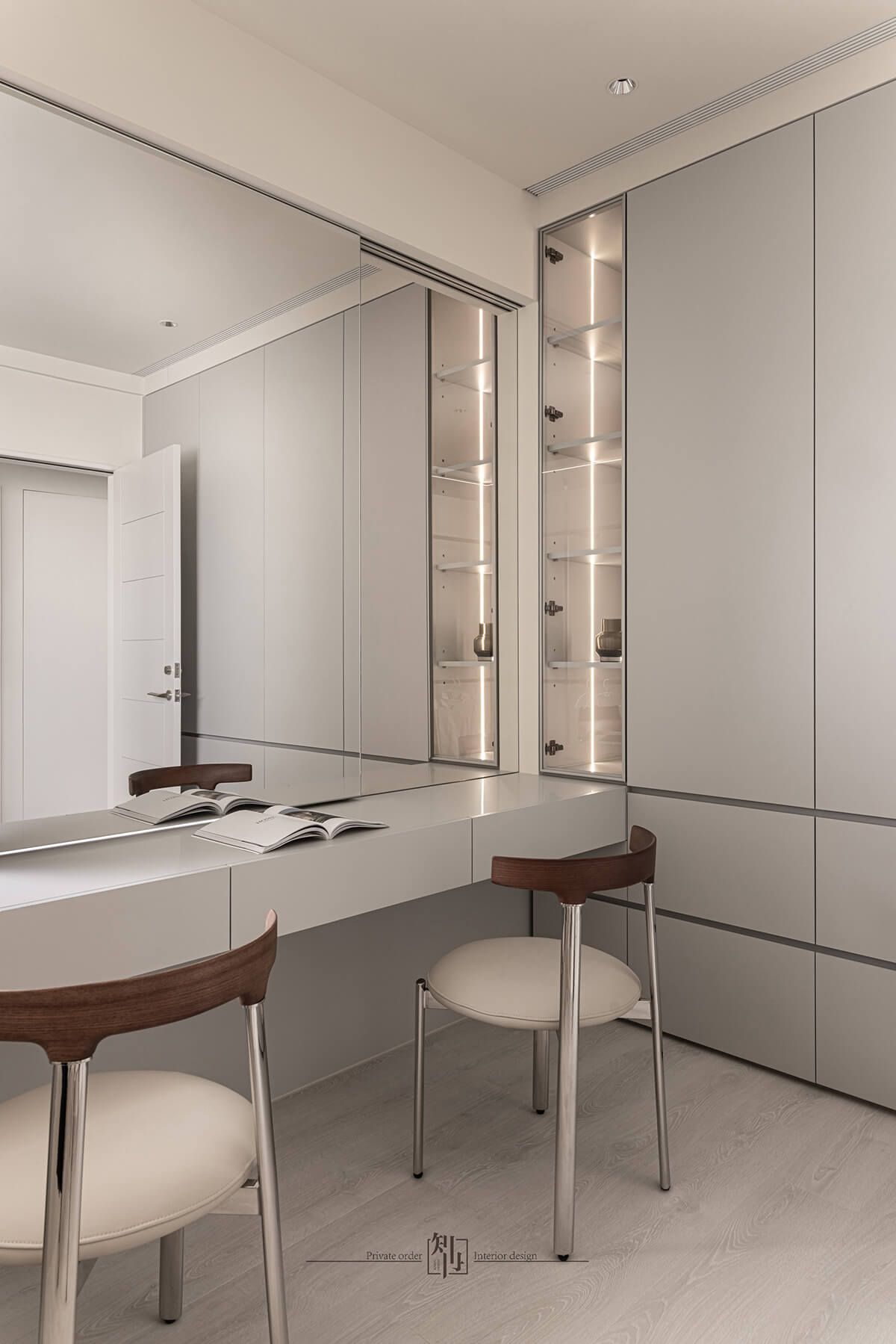 Bedrooms extend the language of restraint. Wooden cabinetry, soft lighting, and tactile fabrics shape an atmosphere of comfort and grounding. White bedding rests quietly in the light, embodying intimacy without pretense. At night, the silence deepens, offering a sense of shelter, as if time itself slows within these walls.