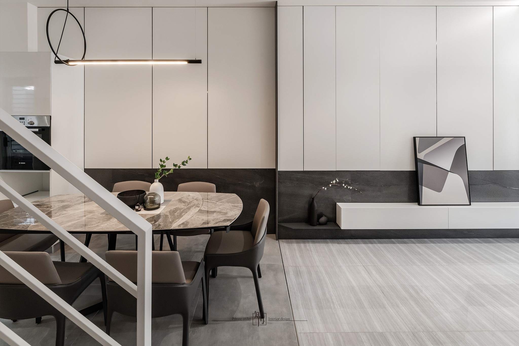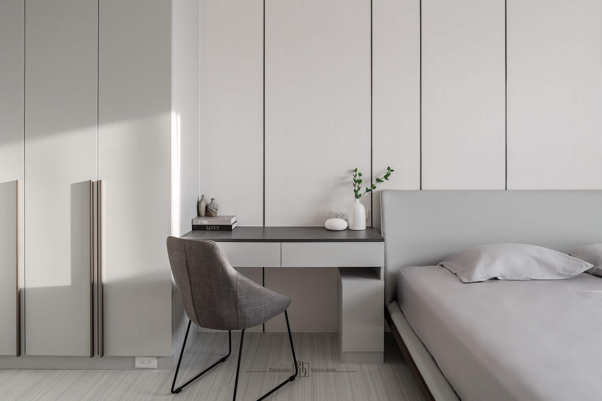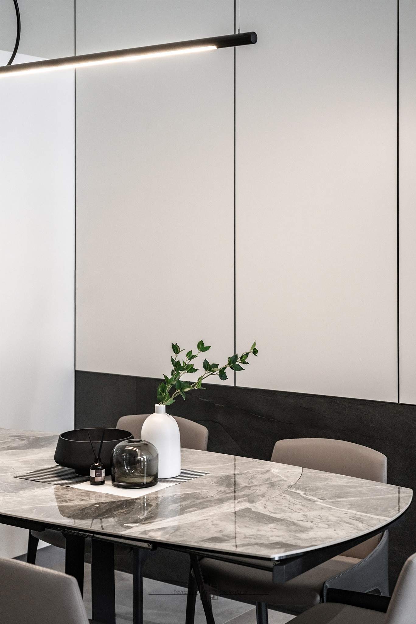 這個項目是為了一個大家庭的住宅,家裡有父母和三個姐妹,每個人的喜好都稍有不同,因此在房間的設計上,每個房間的風格都有所不同。考慮到家中有較多的居住人口,我們非常注重收納的部分。為了避免長時間居住造成視覺上的混亂,我們增加了更多的嵌入式儲物櫃。在公共空間的設計上,我們設置了可以讓全家人一起用餐的大理石長桌,整體設計風格以現代簡約為主。這是一個明亮、簡潔且同時具有美感的作品。